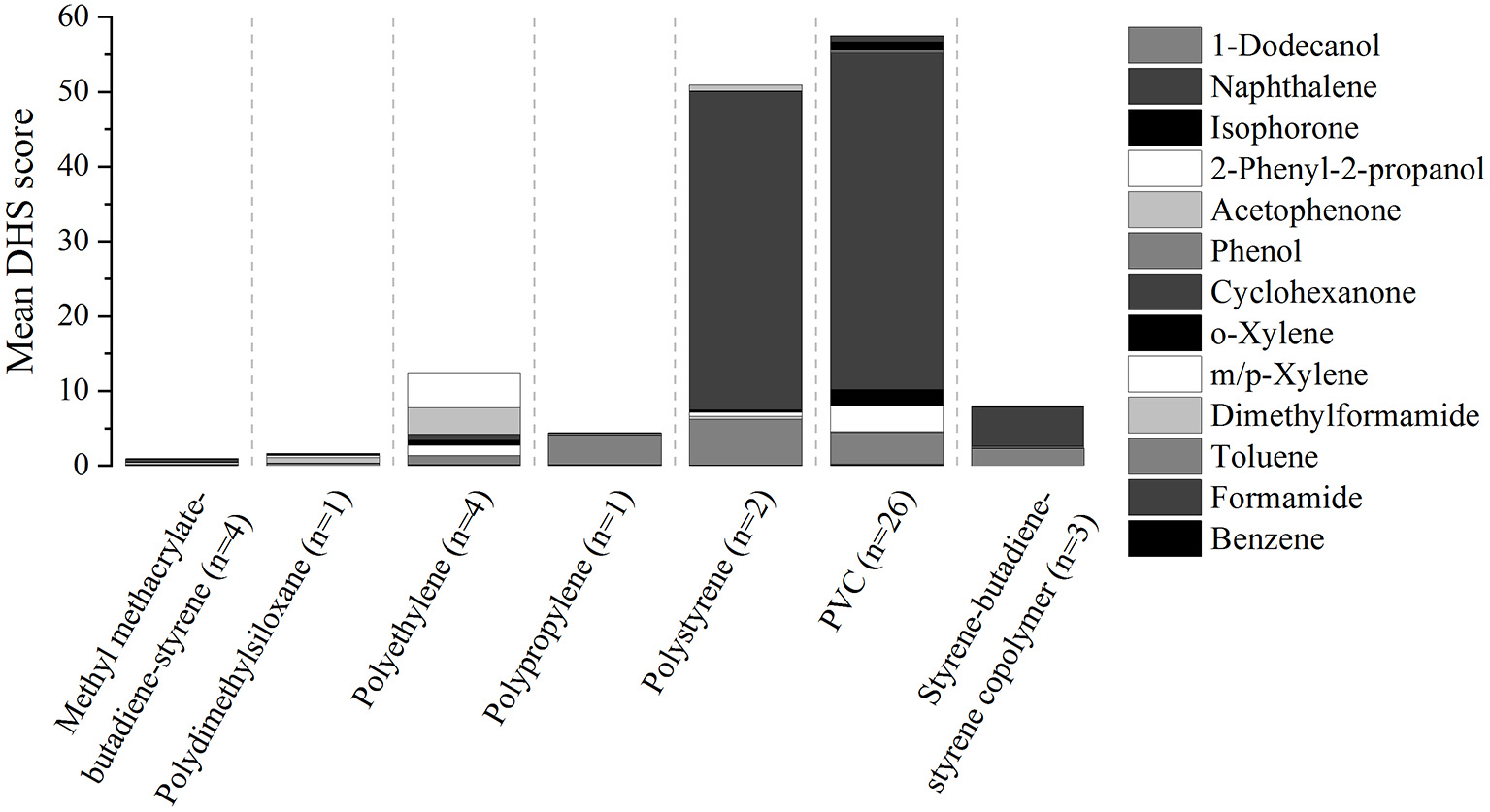 In Figure 2, the sum of the mean analyte DHS score is depicted for each polymer type. The highest scores were found for cyclohexanone, toluene and 2-phenyl-2-propanol. It could be observed that softer plastics like PVC, polystyrene or PE emit larger quantities compared to hard ones like polydimethylsiloxane or methyl methacrylate-butadiene-styrene copolymer. This was probably due to the polymer structure: More porous polymer may contain and emit more VOCs because of more inner free space and easier diffusion processes.