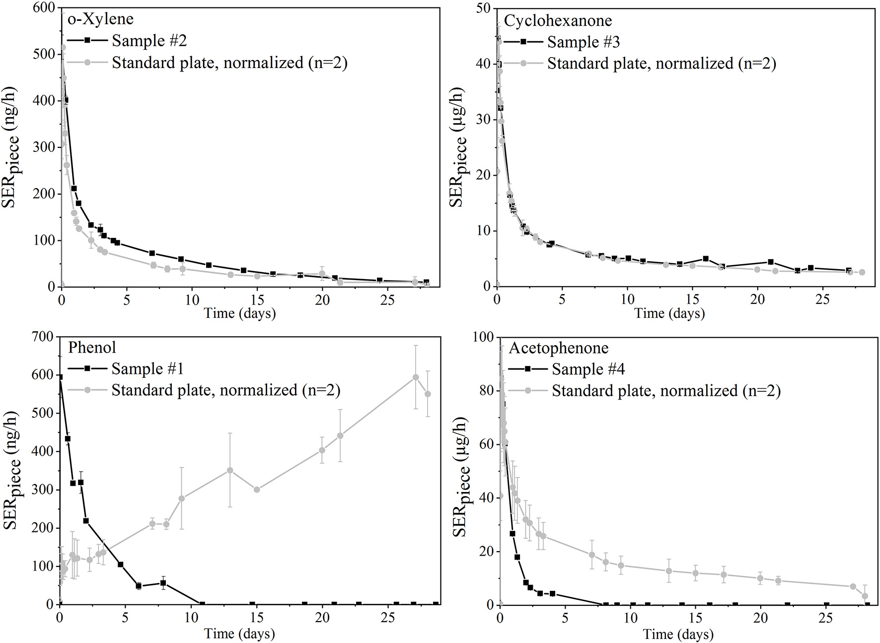 The piece-specific emission rate (SERpiece) profiles of four analytes emitted from the toy samples are shown in black on Figure 4. In gray, the curves obtained for the same analytes from the standard polyurethane plate were normalized to result in the same maximal emission rate.