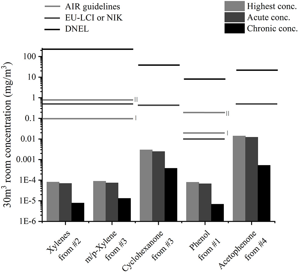 The room concentration is calculated for a 30 m3 room according to EN 16516:2017 (24) and compared to indoor air guideline values. The German Committee on Indoor Guide Values derives limit values (AIR-values, RWI, and RWII) that are based on current toxicological and epidemiological knowledge and correspond to levels where no health impairment is expected, even with a life-long exposition (12). The European LCI (lowest concentration of interest) values or the corresponding German NIK values (13) are usually compared to the emissions of building materials determined after 28 days of testing in the emission chamber. Unlike building materials, toys may be used directly after unpacking, so their emissions for the first hours were here compared to EU-LCI guideline values. The DNEL (Derived No-Effect Level) (23) values are defined by the German social accident insurance as derived exposure levels above which workers should not be exposed. The different values for the target analytes are shown in Table 1. AIR and LCI/NIK values are therefore chronic values while the DNEL is an acute level. For consumer products, lower DNEL values should be considered as they can affect more sensible groups (e.g., children), but those values were not available.