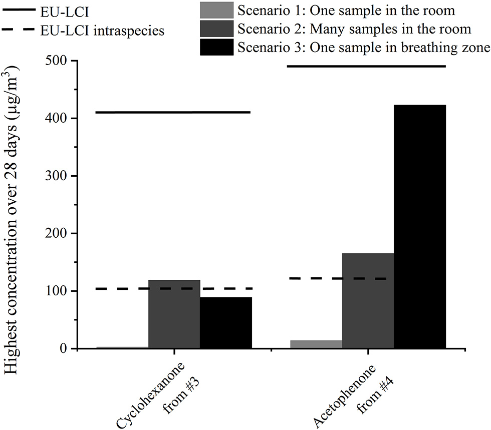 First assessments led to acceptable values for single substances from one product, but the realistic exposure scenario is more complex. Products often emit mixtures of substances that may trigger the same toxicological end point and therefore induce a cumulative effect. Moreover, children's toys only represent an additional source to human activities such as cooking, and other material emissions from building materials or furniture. Furthermore, other exposure scenarios different from the one used in section Exposure Assessment which considers only one sample in one 30 m3 room could be taken into account. In Figure 6, the highest emitted concentrations for two other scenarios are shown for cyclohexanone from sample #3 and acetophenone from sample #4. In the second scenario, not only one but several samples are present in the 30 m3 room: The floor of the model room (12 m2) is carpeted with the play mat or 40 figurines [as suggested in (20)] are present in the room. As the air distribution and ventilation may not be as good in a real room compared to the emission chamber, the air volume around the object may contain higher emission concentrations compared to the rest of the room. In the third scenario, a breathing zone of 1 m3 around the sample, as used in Masuck et al. (19), was considered. Those results were compared to the EU-LCI guidelines. As described in (20), an intra-species factor of four can be considered for a child, as it is more vulnerable than an adult. Only with this consideration did the emission concentrations exceed the guidelines for cyclohexanone from #3 in the first scenario and for acetophenone from #4 in both scenarios.