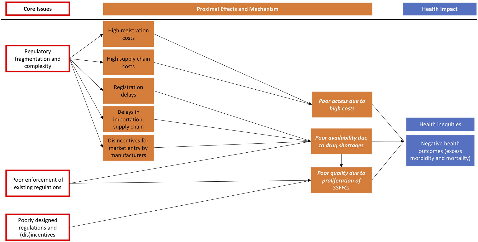 Our framework demonstrates how regulatory fragmentation, poor policy design, and enforcement issues lead directly or indirectly to unintended consequences, which in turn influence population health and health equity. It is important to note that other core issues such as corruption and complex international trade agreements are not depicted in the framework but are also important causes of poor affordability, availability, and quality of drugs (1, 8, 9). In the following section, we explain each pathway and provide evidence. We hope that this framework will be refined over time by empirical research.