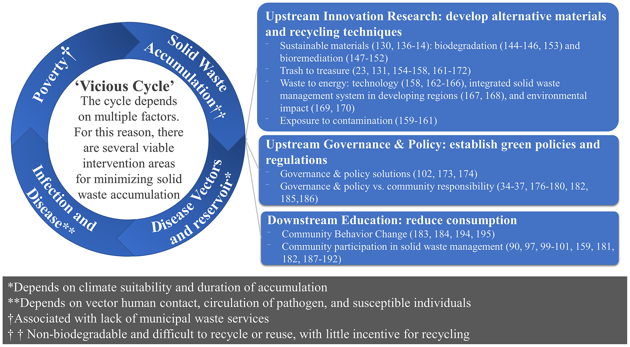 Background: Infectious disease epidemiology and planetary health literature often cite solid waste and plastic pollution as risk factors for vector-borne diseases and urban zoonoses; however, no rigorous reviews of the risks to human health have been published since 1994. This paper aims to identify research gaps and outline potential solutions to interrupt the vicious cycle of solid wastes; disease vectors and reservoirs; infection and disease; and poverty.