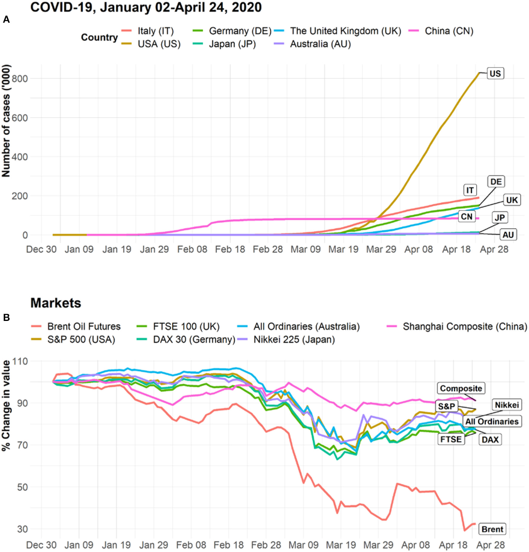 (A) Cumulative number of confirmed cases in emerging epicenters. Data sources: WHO Coronavirus disease (COVID-2019) situation reports (14). (B) Dynamics of the value of stock indices and oil futures relative to January 2, 2020. Data sources: historical data for stock indices and Brent oil futures were extracted from Yahoo Finance (www.finance.yahoo.com). Closing prices are used in the calculations. Daily values are calculated relative to an index value (100) on January 2, 2020.