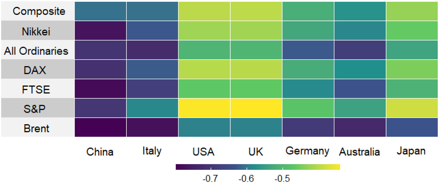 Correlation between the number of COVID-19 cases and stock markets in selected countries.