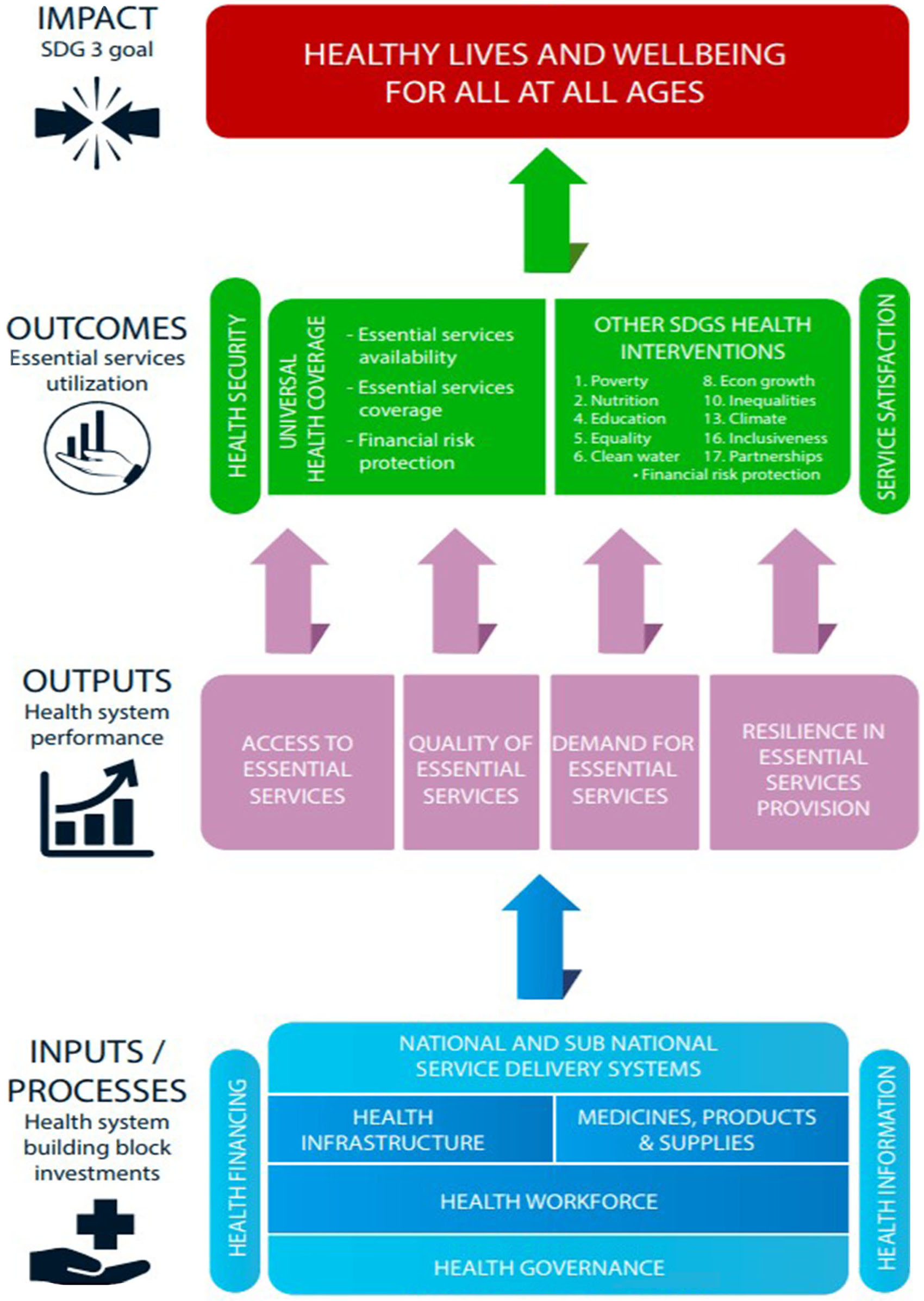 The action framework has four domains defined around possible options of actions for countries. These are operational action points that target to assist countries in deciding priorities about the planning, implementation and M&E of their national health policies. Key domains of action include– Health systems input, output, outcome, and impact. Input domain defines points where health investments are made in the form of hardware and software that produce outputs and translates to defined outcomes and impacts. Related areas of action defined around inputs include–health workforce, health infrastructure, medical products and health technologies, health service delivery, health governance, health financing, and health information, research and innovation (2). Health output domain define standards by which health systems performance are measured. These are elements needed for effective service delivery of essential health interventions. Areas of performance defined around this domain include: Health system resilience, efficiency and equity of access, quality of care, and service demand (2). The third domain relates to population coverage outcomes with essential interventions including the vulnerable and marginalized groups. Prioritized health outcome areas include: Availability of essential services for life-course cohorts, coverage of essential services across related groups, health security, health financial risk protection, client satisfaction, and cross-sector coverage of essential health services with other SDGs (2). Lastly, the impact domain is related to the SDG 3– Healthy lives and well-being for all at all ages. This goal is expected to be achieved by all African nations by 2025. Elements contained in this thematic area include: Improvements in life expectancy, morbidity and mortality reductions, and risk factor reductions among individuals (2).