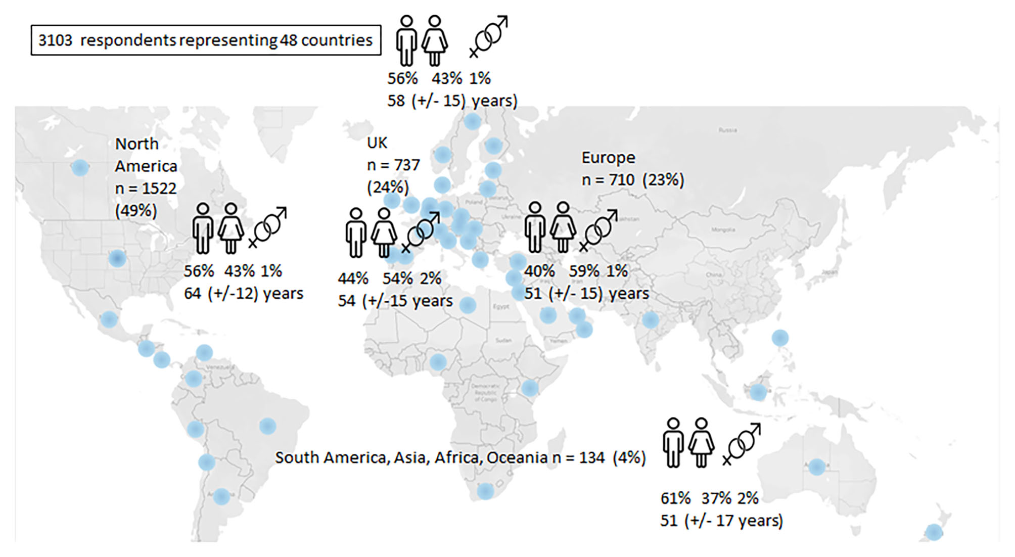 There were 3,400 respondents. Of these 38 did not provide consent and 259 responses were largely incomplete. The remaining 3,103 respondents represented 48 countries, although some countries were only marginally represented. The highest number (49%) were from North America (USA, Canada), followed by 47% from Europe (European Union and the United Kingdom). For comparative purposes, the whole sample was divided into four groups, a cohort from North America (49%), one from the United Kingdom and Ireland (UK = 24%), a combination of other European countries excluding the UK (e.g., Belgium, The Netherlands, Sweden, Norway, Portugal, France = 23%) and a group representing a combination of other countries located in South America, Oceania, Asia, and Africa (4%) as shown in Figure 1. The age range was 18–100 years with a mean of 58 years (SD:14.0; SE 0.3) with an even gender divide and ethnic distribution where the majority were white (92%) with other ethnic groups (Asian, Black, Hispanic, Indian, or mixed-ethnicity) each representing under 2% of the respondents, respectively.