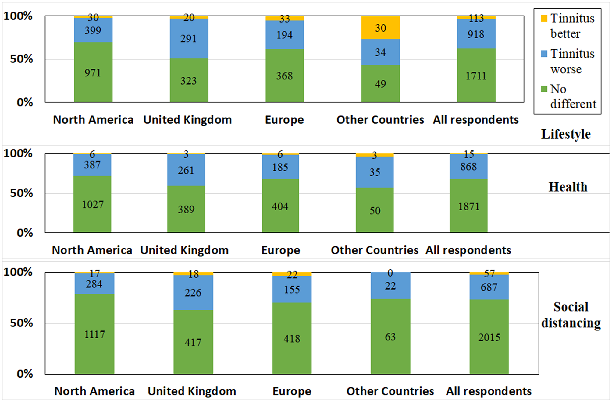 Lifestyle changes stemming from COVID-19 did not affect tinnitus for 62% of respondents, exacerbated tinnitus for 34%, and improved it for 4%. There were significant differences between locations (X2 (12) = 232; p = 0.001*), as lifestyle changes impacted those in the UK (46%) significantly more (p = 0.001*) than those in North America (29%), as seen in Figure 3. From the free text responses, some respondents reported tinnitus starting during the pandemic and assumed this was related to lifestyle changes saying “No one knows why my tinnitus started, it may be from staying at home, being out of routine or the stress” (Female, 44 years, UK).
