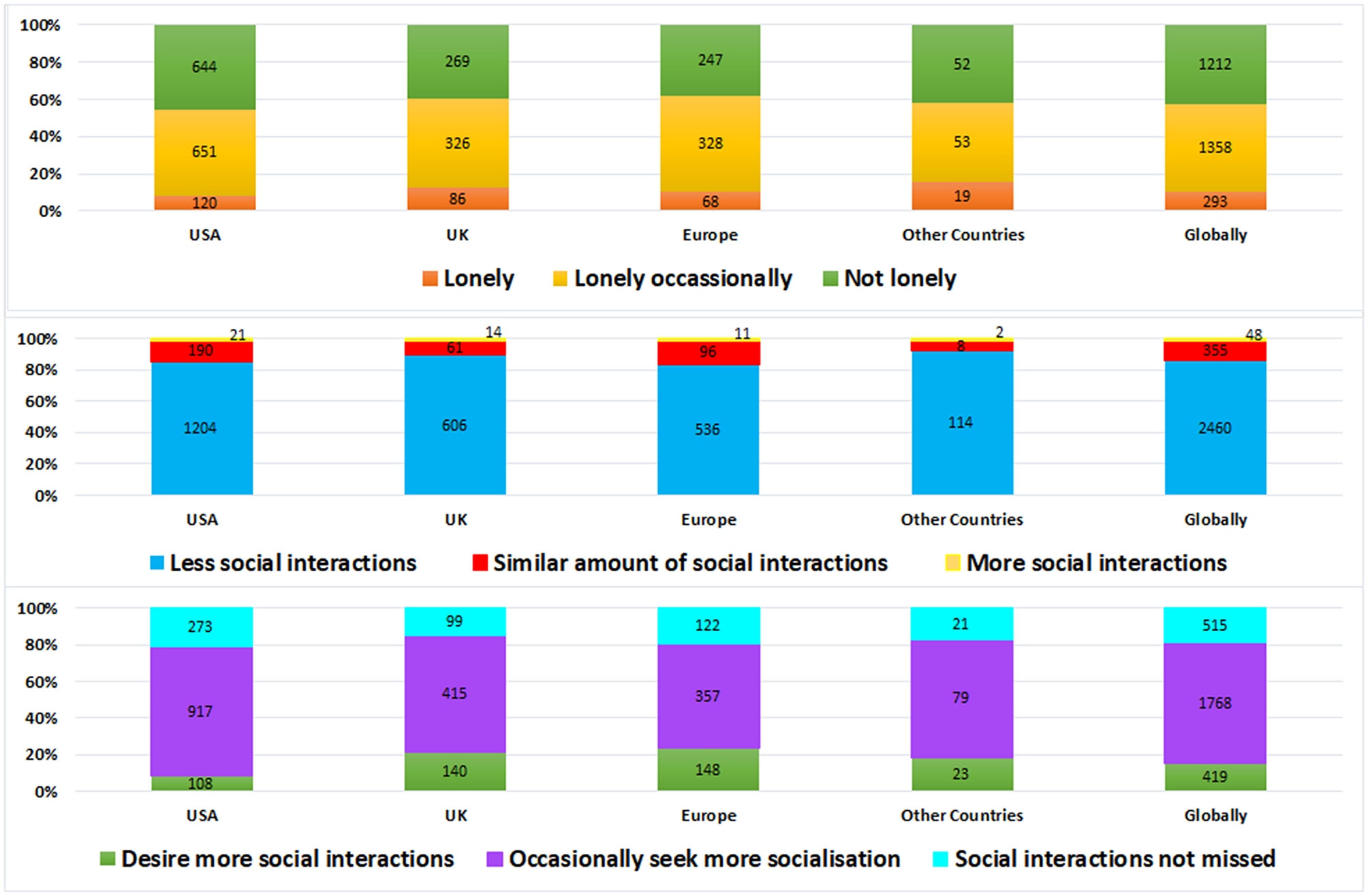 Figure 5. The frequency of social interactions, desire for more interactions and loneliness experienced during the pandemic across different locations.