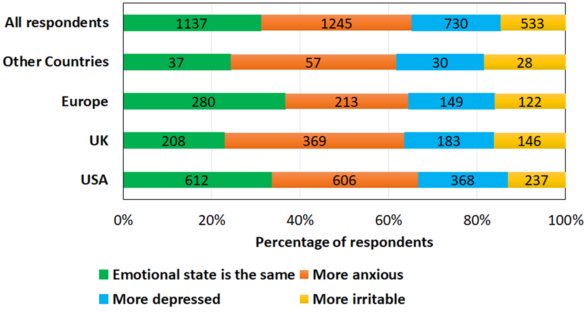Emotional well-being experiences varied across locations as seen in Figure 6 with those from the UK reporting more anxiety/depression and irritability during the pandemic (77%) and Europeans the least (67%).