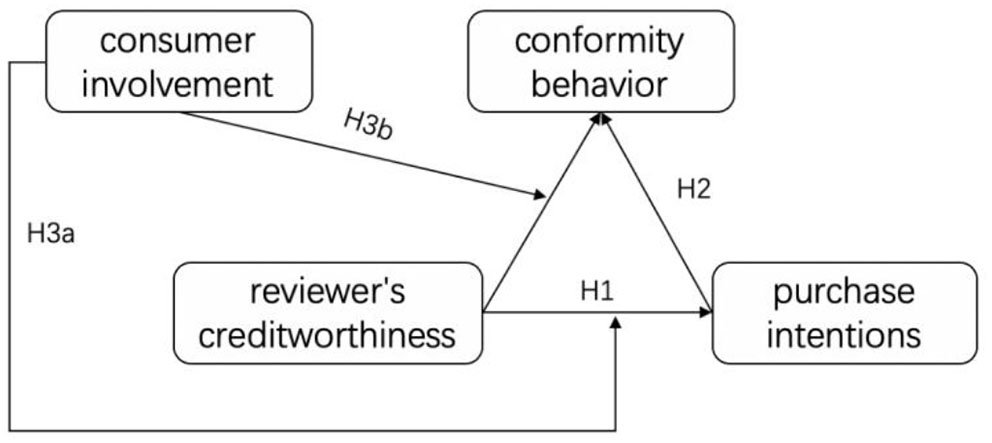 H3b: The influence of consumer involvement on the relationship between reviewers' creditworthiness and the purchase intention is achieved through the intermediary of the conformity behavior. The higher the consumer involvement, the less influence the reviewers' creditworthiness has on the conformity behavior and the corresponding. The positive impact of purchase intention is weaker.