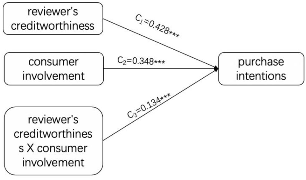 Since the model is a saturated model, chi-square = 0, df = 0, CFI = 1.000, TLI = 1.000, RMSEA = 0.000, and standardized root mean square residual (SRMR) = 0.000, the model fits well. As can be seen from Figure 2, reviewers' creditworthiness significantly predicts the purchase intention (c1 = 0.428, t = 10.948, p = 0.000), assuming H1 is verified. The interaction between reviewers' creditworthiness and the consumer involvement has a significant effect on the purchase intention (c3 = −0.134, t = −3.611, p = 0.000), indicating that the consumer involvement is in reviewers' creditworthiness. Play a regulatory role in the influence of purchase intention, assuming H3a is verified.
