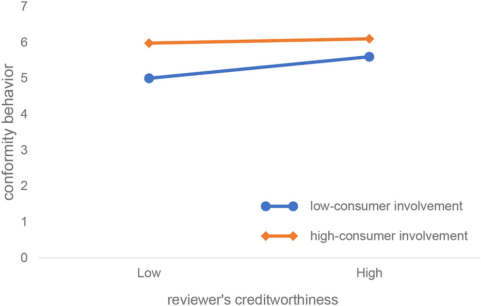 Figure 5, which is obtained by simple slope analysis, more clearly shows how reviewers' creditworthiness and consumer involvement interact to influence conformity behavior. As can be seen from Figure 5, compared with consumers with high involvement, the value of the reviewers' creditworthiness to the conformity behavior is larger (the regression line is steeper), indicating reviewers' creditworthiness. The same degree of change can trigger a greater change in conformity behavior in low-involvement consumers; that is, the credibility of the low-involvement consumer is more sensitive to changes in conformity behavior.