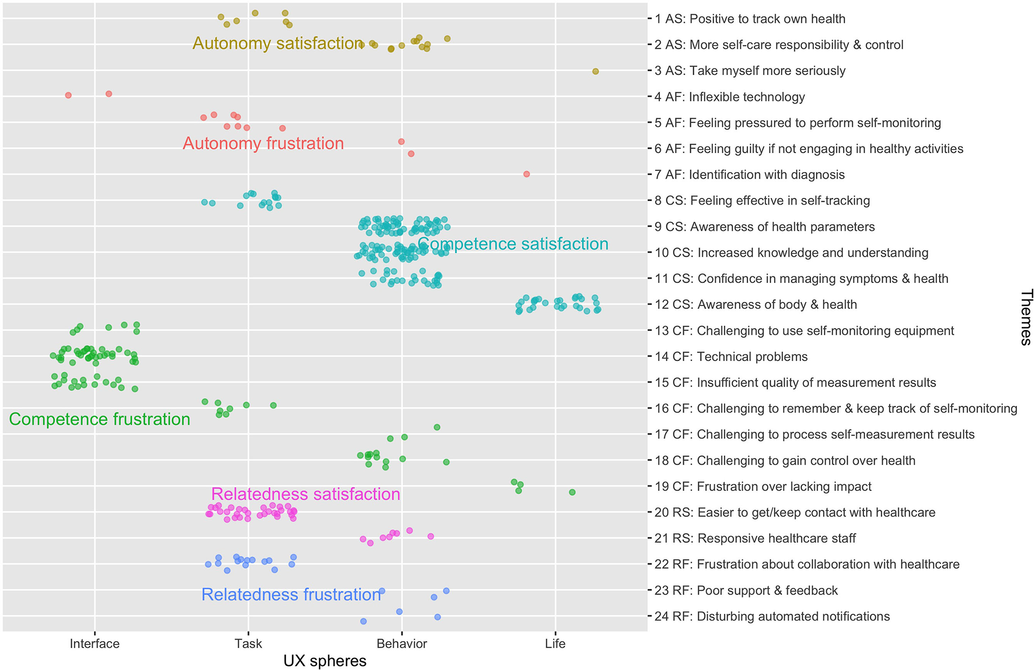 The different themes of need satisfaction and frustration within different spheres of user experience (UX). The dots represent the number of individual codes that contributed to each of the identified themes and user experience spheres. The colored dot fill reflects our classification into autonomy satisfaction (AS), autonomy frustration (AF), competence satisfaction (CS), competence frustration (CF), relatedness satisfaction (RS), and relatedness frustration (RF).