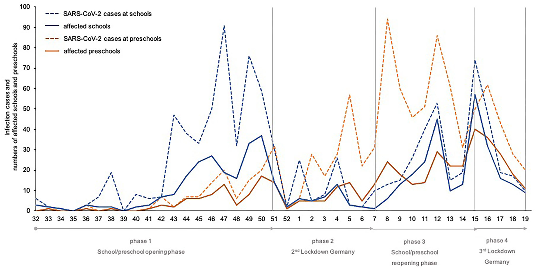 Figure 1. Total number of SARS-CoV-2 cases at schools and pre-schools in the study period (week 32/20–19/21) divided into the different phases of infection control measures in Mecklenburg-Western Pomerania.