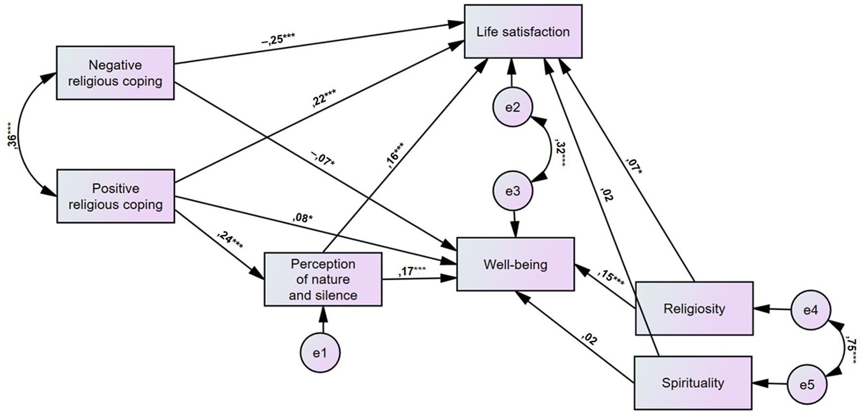 Study model: Relationships between religious coping, perception of nature and silence, satisfaction with life, and well-being (N = 1,010; *p < 0.05, ***p < 0.001).