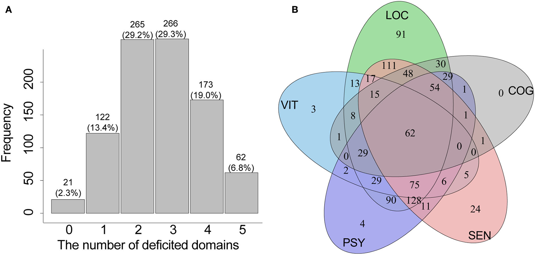 The distribution (A) and overlap (B) of the IC domains among older inpatients. IC, intrinsic capacity; LOC, locomotion domain; SEN, sensory domain; PSY, psychological domain; COG, cognition domain; VIT, vitality domain.
