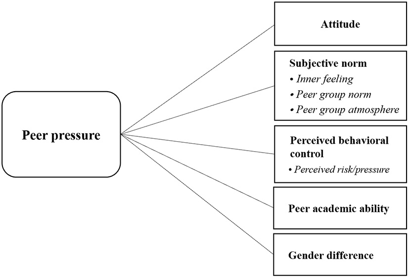 Peer pressure is not a unitary (i.e., one-dimensional) construct, but rather a multidimensional one (28). Based on the above dimensions of TPB and the specific connotation of peer pressure, the relevant literature was further sifted and summarized, and peer pressure was categorized into three dimensions: attitude (in this study, attitude refers to engineering students' attitudes toward learning and peer pressure), subjective norms and perceived behavioral control (23, 26), as shown in Figure 2. Among them, the connotation of subjective norms includes group atmosphere, group norms and inner feeling, and perceived behavioral control includes perceived pressure. In addition to the above three dimensions, for enhancing the explanatory power of TPB, two important factors inherent in peer pressure—gender difference and peer academic ability—were added to this study based on the analysis of existing studies in the literature.