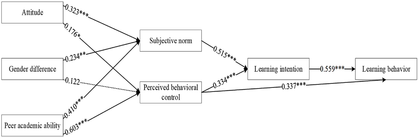 Attitude is an individual's overall evaluation of the implementation of a particular behavior (14). Psychologists believe that attitudes are formed gradually through interactions with others and the surrounding environment, i.e., attitudes have social properties (15). As a central factor influencing behavioral intentions, attitudes also interact with subjective norms and perceived behavioral control, but the specific mechanisms vary depending on the subject and the context in which the study is conducted (13). Indeed, the TPB theoretical framework suggests that attitudes may also inversely influence subjective norms and perceived behavioral control, and the expansion and reshaping of attitudinal relationships can enhance the explanatory degree of the model. This study concludes that the more positive students' attitudes toward learning and peer pressure, the more they receive positive personal norms and exemplary normative pressure, which affects learning behavior.