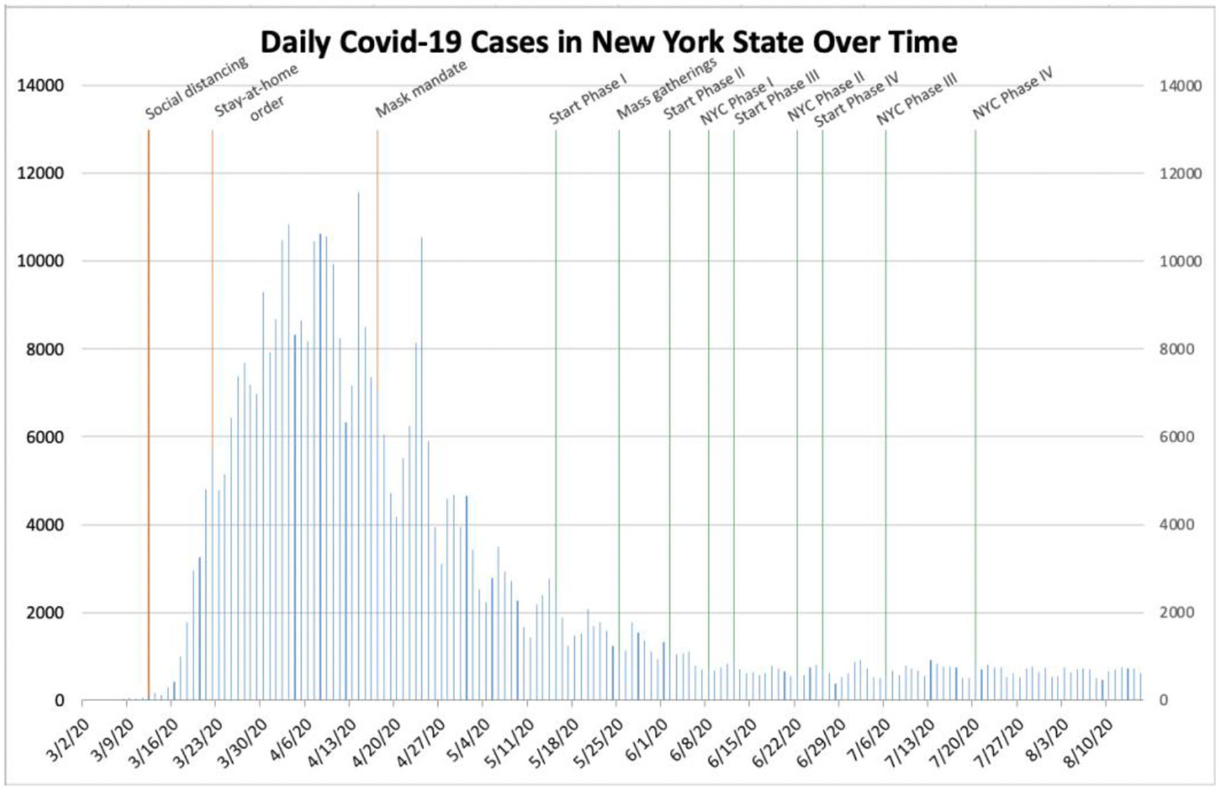 We first collected data pertaining to the number of daily cases of COVID-19 within New York State from the beginning of March to August 15, 2020 (3). New York was chosen due to both our location within the state and New York City's distinction as an early epicenter of COVID-19 within the United States. We plotted the dataset as an epidemiological curve and subsequently superimposed various governmental interventions onto it (Figure 1). Due to the incubation period of SARS-CoV-2, estimated by the Centers for Disease Control and Prevention to be 2 to 14 days (4), we hypothesized that the initial effect of each intervention would likely be observed after approximately 14 days. We analyzed the curve with careful inspection.