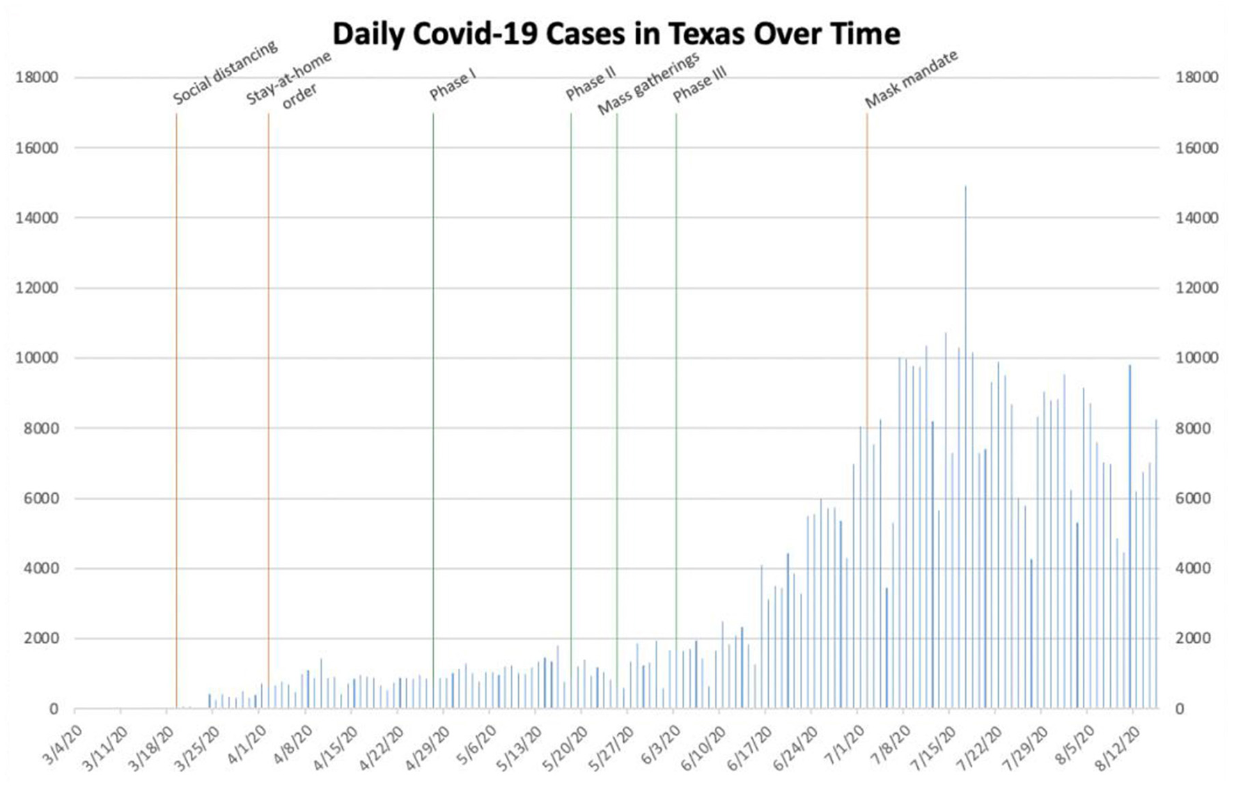 In Texas, social distancing was initially implemented on March 19th (15). At this point, the number of daily cases statewide had only reached as high as 34. On April 2nd, as cases began to increase slightly in the state, Governor Greg W. Abbott instituted a statewide stay-at-home order (16). Afterwards, the number of daily cases in Texas remained <2,000 for several months. On April 27th, Phase I of Open Texas, the plan to re-open non-essential businesses within the state, began (Table 1) (10). Phases II and III followed soon after on May 18th and June 3rd, respectively. Between these latter two phases, mass gatherings similarly occurred throughout Texas. After the implementation of Phase III, the number of daily cases within the state began to sharply increase. On June 16th, the number of new daily cases exceeded 4,000; this marked only the second time Texas had exceeded even 2,500 daily cases. In the ensuing weeks, the number of daily cases continued to increase, consistently exceeding 10,000 in the middle of July. As daily cases were still trending upward, Governor Abbott instituted a statewide mask mandate on July 2nd (17). While the number of daily cases continued to increase immediately following this mandate, cases soon plateaued and never once exceeded 10,000 from July 18th through the end of our data collection on August 15th.
