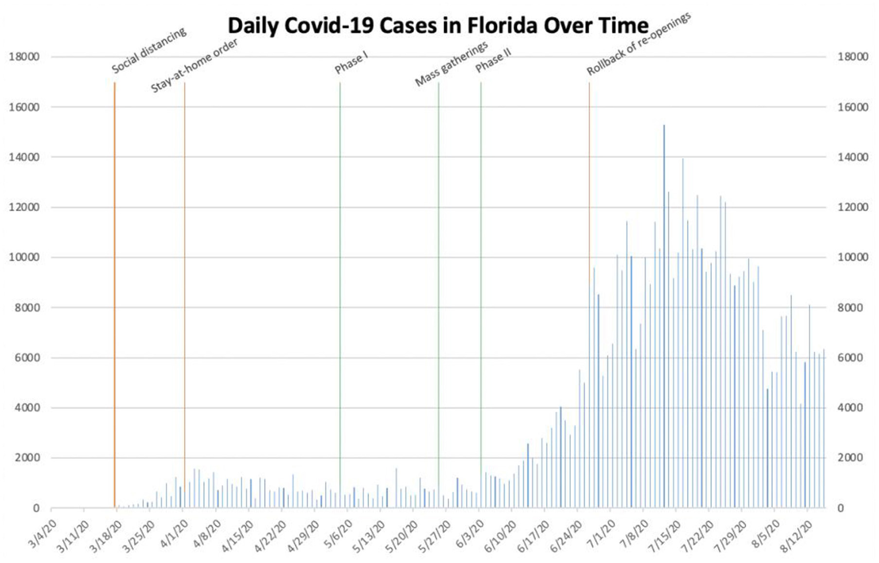 In Florida, initial social distancing guidelines were implemented on March 17th (18). At that point, the number of daily cases statewide had not yet exceeded 50. On April 1st, as the number of daily cases approached 1,000, Governor Ron D. DeSantis issued a monthlong stay-at-home order (19). Following the implementation of the stay-at-home order, the number of daily cases remained less than 2,000. On May 4th, Florida entered Phase I of its Plan for Florida's Recovery (Table 1) (11). Florida later entered Phase II on June 5th. In between, as in other states, mass gatherings occurred throughout Florida following the death of George Floyd. June 13th, when the number of daily cases first exceeded 2,000, marked the beginning of a statewide outbreak. A steep increase in the number of daily cases led to Governor DeSantis re-closing bars statewide on June 26th in an attempt to slow the then almost-exponential increase of COVID-19 cases (20). Cases subsequently reached their peak on July 12th and then slowly began to decrease again through the end of our data collection.