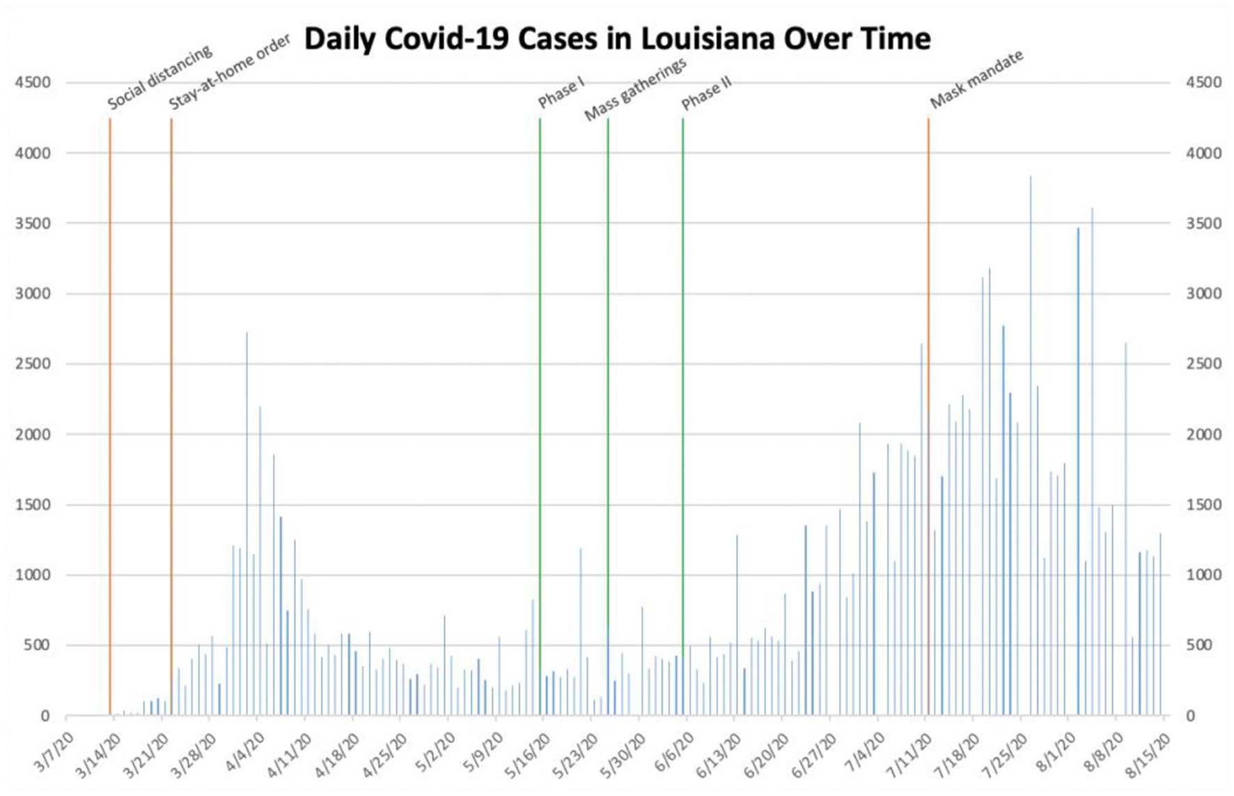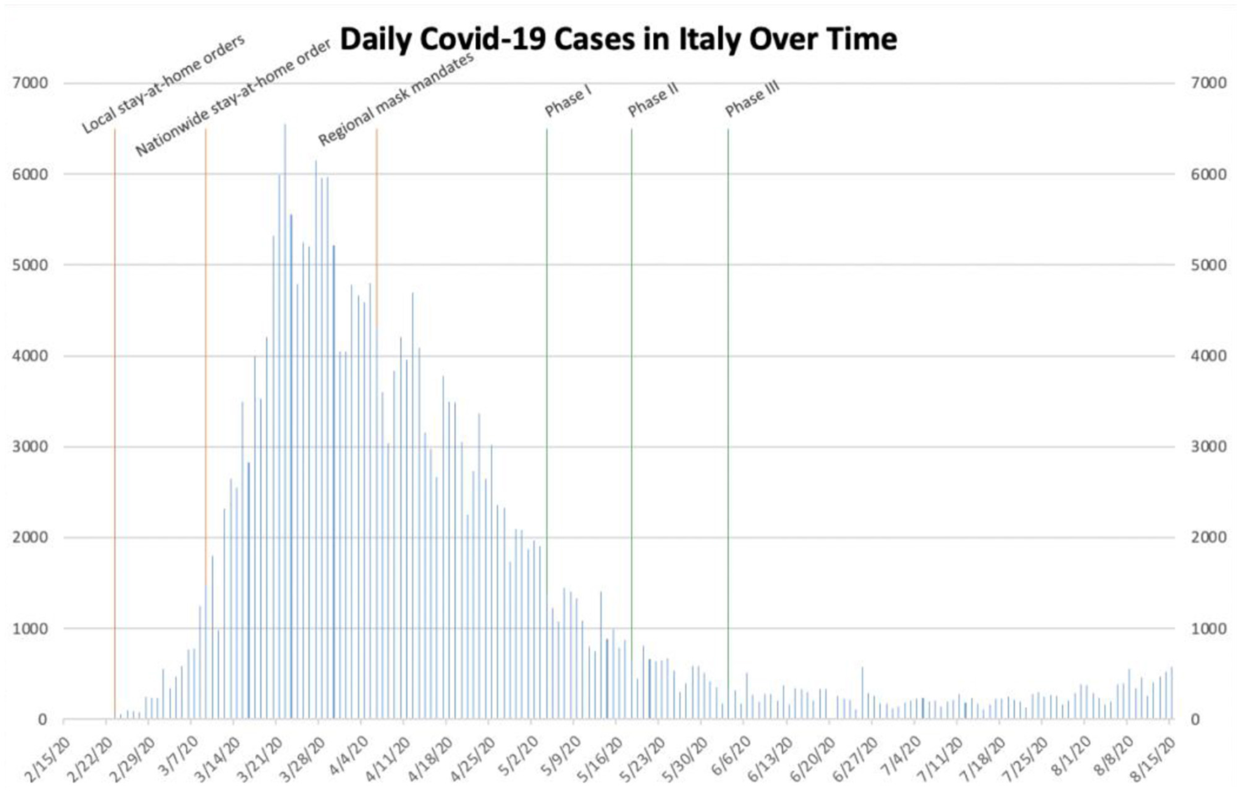 Based on the data collected, it is reasonable to conclude that governmental interventions, especially stay-at-home orders and mask mandates, have been successful to varying degrees in stemming the spread of SARS-CoV-2 within these different locations. In New York, the stay-at-home order seemingly helped to drastically decrease the number of daily cases during the early outbreak, while a mask mandate and social distancing measures likely helped prevent a future outbreak, even after businesses re-opened and mass gatherings took place (Figure 1). In Texas, Phase III of Open Texas and the July 4th holiday weekend likely both contributed to the subsequent surge in the number of daily cases. The mask mandate seemingly helped slow the spread of SARS-CoV-2 later, in the midst of an outbreak (Figure 2). In Florida, Phase II of its re-opening initiative likely contributed to the ensuing outbreak, as the number of daily cases increased from <2,000 to more than 10,000 within the subsequent month. The June 26th re-imposition of restrictions on bars statewide seemingly helped control the outbreak, as cases began to sharply decrease approximately 2 weeks afterwards (Figure 3). Since Florida never instituted a statewide mask mandate, it is impossible for us to determine the effect of sporadic, optional mask wearing throughout the state. The stay-at-home order in Louisiana likely helped reverse a sharp early increase in daily cases, as a resultant decline was seen after approximately 10 days. After Phase II of its re-opening initiative was implemented in early June, cases increased from 427 to more than 1,300 within 3 weeks and continued to increase to more than 3,800 by the end of July. The mask mandate implemented on July 11th ostensibly helped reverse this trend, as cases reached a peak 15 days later and then began to decrease sharply (Figure 4). When Italy was an early global COVID-19 epicenter, a nationwide stay-at-home order likely contributed to the drastic reduction in the number of daily cases that began 13 days later. It is also possible that previously implemented provincial mask mandates and social distancing measures helped prevent a second widespread outbreak within the country through the middle of August (Figure 6).