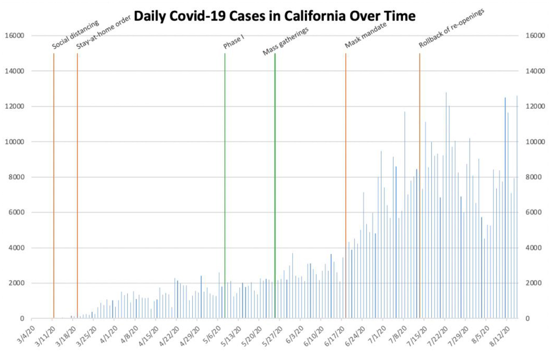 Initial social distancing guidelines in California were implemented on March 11th (24). On March 19th, Governor Gavin C. Newsom issued the first stay-at-home order in the country (25). The number of daily cases continued to slowly increase for 2 weeks following this proclamation before reaching a steady state of ~2,000 for more than 2 months. On May 8th, as the number of daily cases remained approximately 2,000, California entered Phase I of its Blueprint for a Safer Economy (Table 1) (13). Two and a half weeks later, mass gatherings unfolded throughout the state following the death of George Floyd. Cases then increased slowly for approximately 3 weeks. When the number of daily cases exceeded 4,000 for the first time on June 18th, Governor Newsom immediately instituted a statewide mask mandate (26). Despite the mask mandate, the number of daily cases statewide continued to steadily increase to more than 10,000. On July 13th, Governor Newsom announced the re-implementation of previous restrictions (27). Afterwards, the number of daily cases began to decrease; it reached its nadir of ~4,500 cases on August 4th. However, it then began to rapidly increase once again, exceeding 11,000 several times in the middle of August.