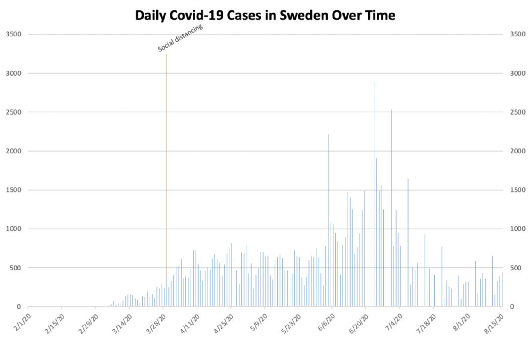 Sweden, in contrast to the aforementioned locations, did not enact any true governmental interventions in an effort to stem the spread of SARS-CoV-2. Despite the fact that Sweden reported its first confirmed case of COVID-19 in late January, the Swedish government did not formally recommend social distancing guidelines until March 29th (33, 34). This remained the only domestic measure aimed at stemming the spread of SARS-CoV-2 instituted through at least August 15th. Despite this, the number of daily cases nationwide remained <1,000 until June 4th. The country reached its peak of almost 2,900 daily cases soon after, on June 23rd. The number of daily cases returned to <1,000 after approximately 4 weeks and remained that way through August 15th.
