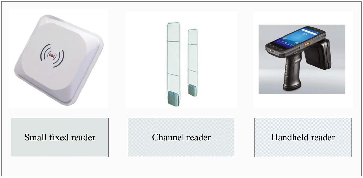 Radio frequency identification technology uses the three components of tags, readers and computer systems to identify item information while transmitting information (15). Among them, the RFID tag is mainly used to store the product information of the identified object and has unique identification; the reader can read and write the information of the RFID tag. The readers generally used are handheld and fixed. The fixed type can be divided into two types: channel type and small fixed type, as shown in Figure 1.