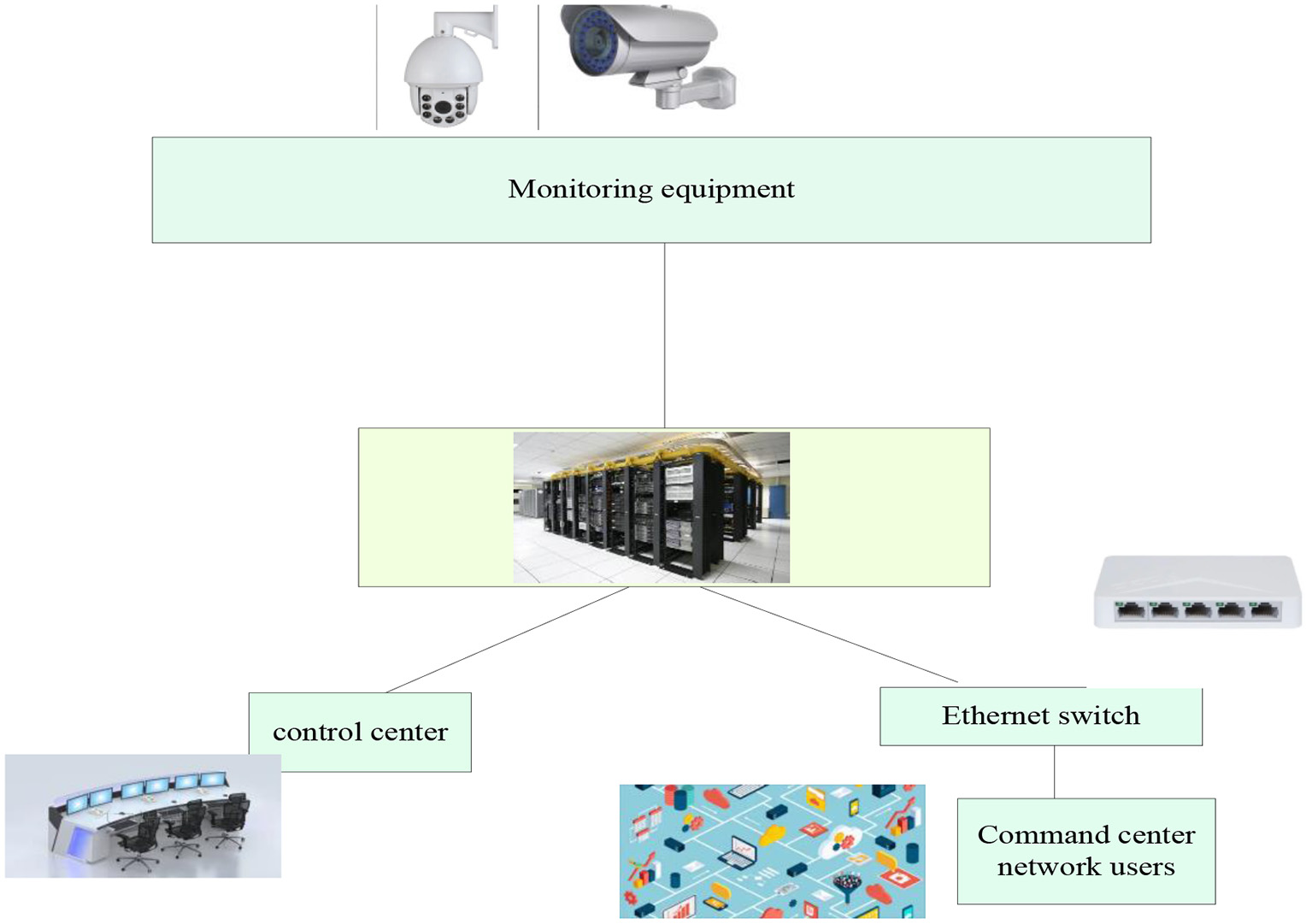 The front-end equipment of the video surveillance system is usually composed of the camera body, lens (long focus/short focus), mounting bracket, protective cover, optical transceiver, optical cable splice box and other components. Each component is transmitted through a variety of transmission methods, such as coaxial cable, wireless AP or optical fiber transmission medium establishes a closed loop with the central switching equipment and server (24). In the actual video surveillance system, the front-end equipment will be selected according to the actual environment and conditions, but the camera and lens are the most basic components. Only the front-end has the video image collection, and the back-end video image storage and monitoring can be carried out. Figure 4 shows the basic structure of the video surveillance system.