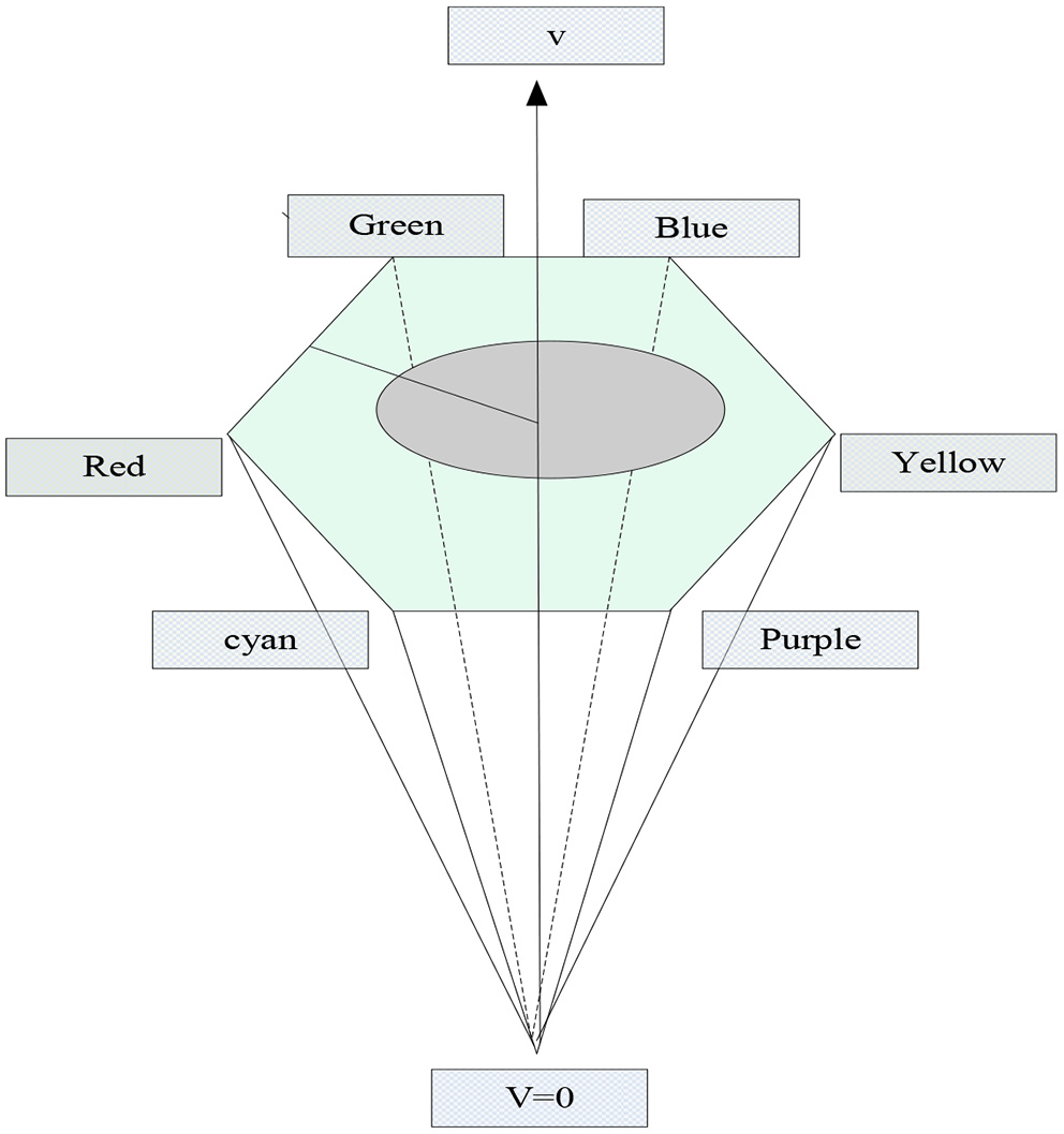 HSV, which can also be called HSI, is a color model proposed by Munseu based on the separation of chroma, saturation, and brightness. HSV is an intuitive color model for the user. In this color model, H represents the chromaticity of the color information, that is, the chromaticity information of the color is represented by this one channel, unlike the previous color model, which is represented by multiple channels. S represents the saturation of the color information, that is, the depth of the color. V represents the brightness of the color information. The color model established in this way can be represented by a hexagonal pyramid, as shown in Figure 6.