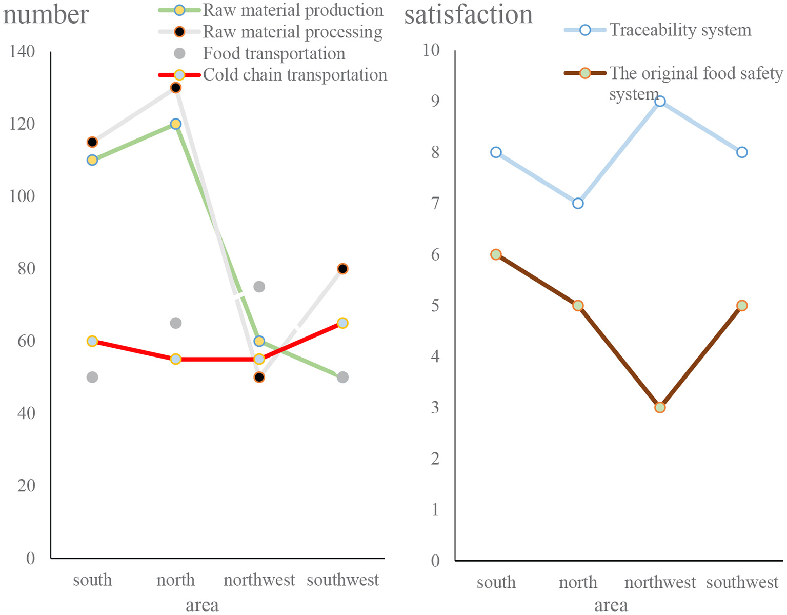 From Figure 10, we can conclude that in the entire food production process, more than 36.5% of the people pay more attention to food processing and the production of food raw materials, and in the food safety system, people are satisfied with the food safety traceability system. The degree is 15.6% higher than the original food safety system.