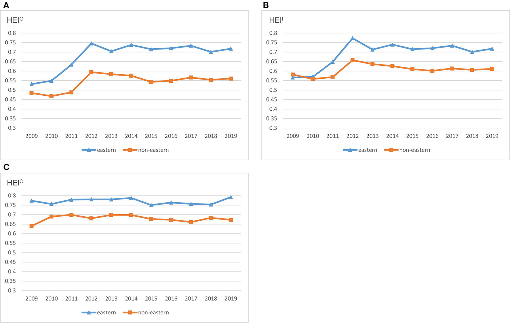 Figure 1 provides the empirical results of three average HEI in two regions from 2009 to 2019. In Figure 1A, HEIG values in the eastern region are obviously higher than those in non-eastern region during the whole study period, implying significant regional differences. It is interesting to find that HEIG values in eastern region show similar time trend to that in non-eastern region. HEIG in two regions exhibits the largest increase from 2011 to 2012 and reaches the maximum in 2012 simultaneously. The most likely reason is the whole coverage of basic health insurance of China in 2011 (39), which improves the access to health services for people with health insurance. After 2012, the HEIG values remain stable with the trend of fluctuation.