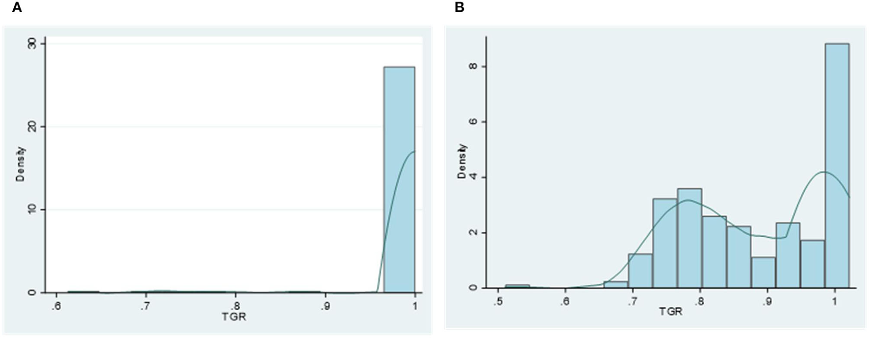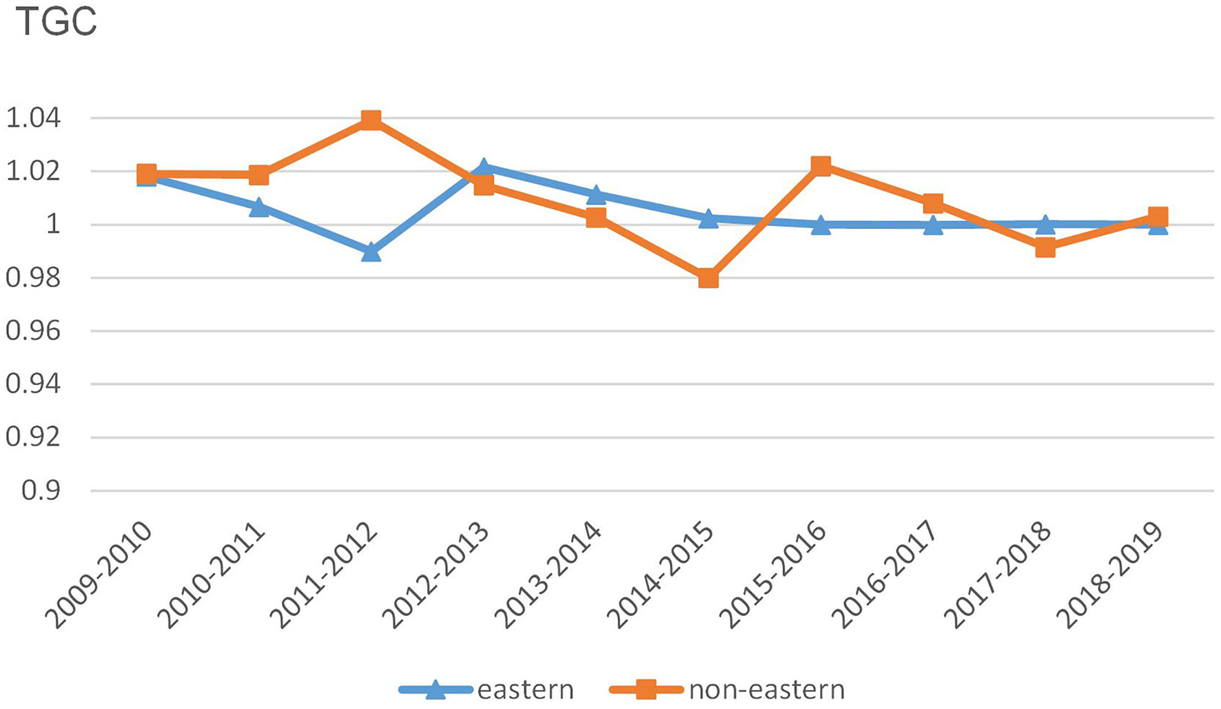 TGCt,t+1 (technology gap change) measures changes in technology gap between intertemporal frontier and global frontier during two periods. This indicator is the ratio of TGR in year t+1 to that in year t. If TGR =1, the HEI calculated by the intertemporal frontier NDDF is equal to that calculated by the global frontier NDDF, implying the leading position in inventing new technologies. The group which has more DMUs with TGR = 1 is the leading group (33). Correspondingly, TGCt,t+1 collects the changes in technology leadership. If TGCt,t+1 >1, it represents a decrease in the technology gap between the aforementioned two frontiers. TGCt,t+1 <1 is interpreted conversely.