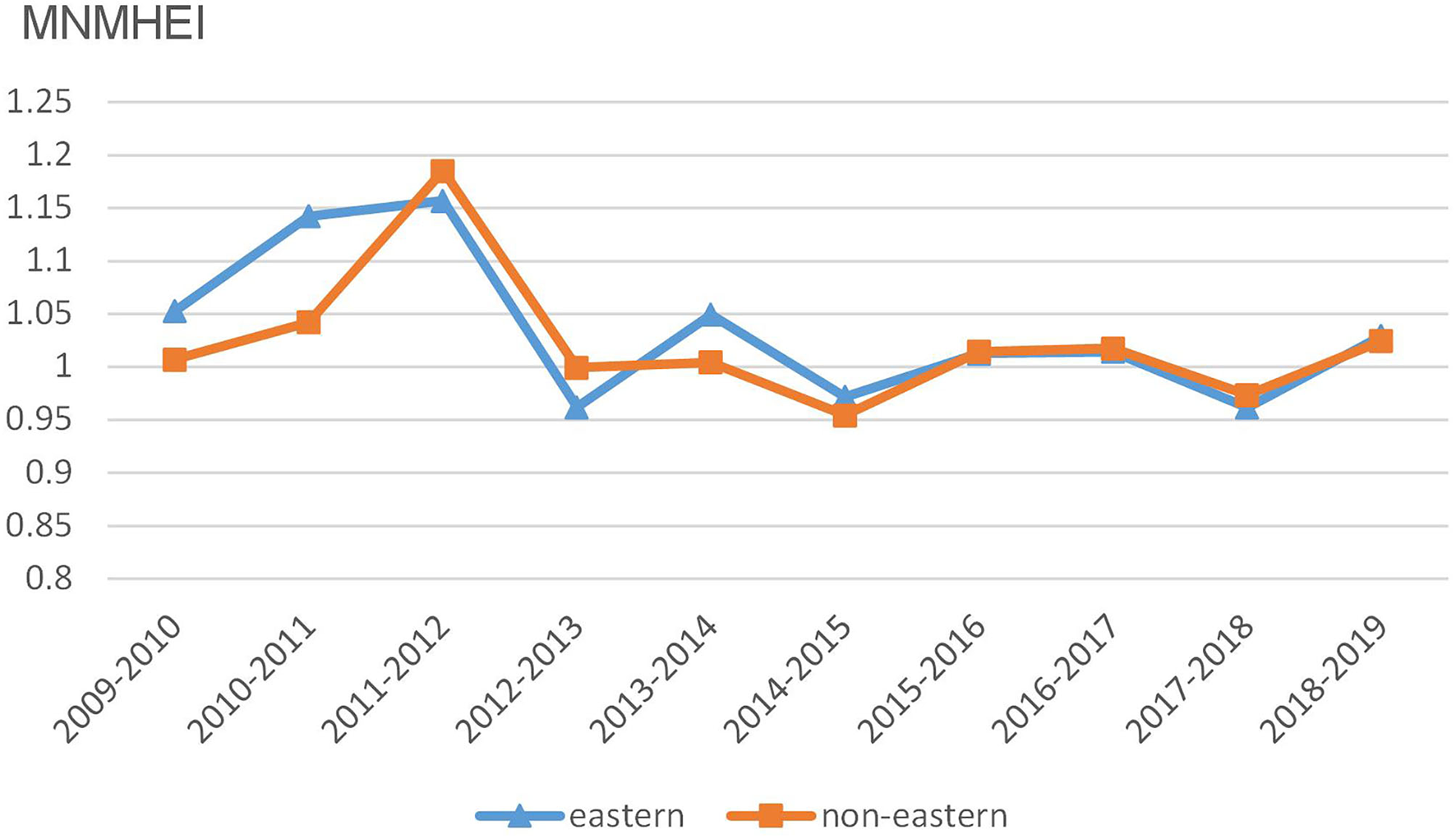 The dynamic changes in unified healthcare efficiency are evaluated by MNMHEI. Table 2 reports the results of average MNMHEI and its decomposition for each of the provinces. The average MNMHEI in China is 1.0268, implying that the unified healthcare efficiency under the global frontier increases annually by 2.68% from 2009 to 2019. Both eastern and non-eastern regions show an upward trend, with an average growth rate of 3.53 and 2.22%, respectively. At the provincial level, one province (9.1%) in eastern China and four provinces (20%) in non-eastern China exhibit a decline. Among all provinces, Hubei shows the largest increase (8.67%) whereas Guizhou is the province that demonstrates the largest decrease (−4.26%).