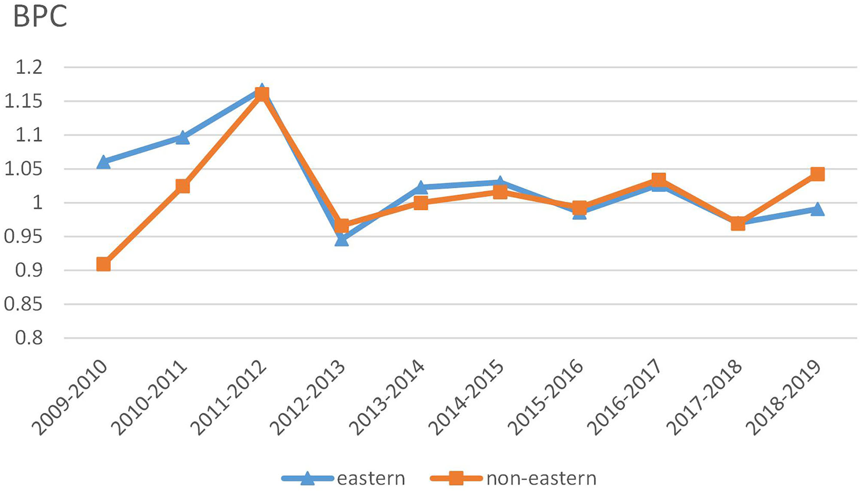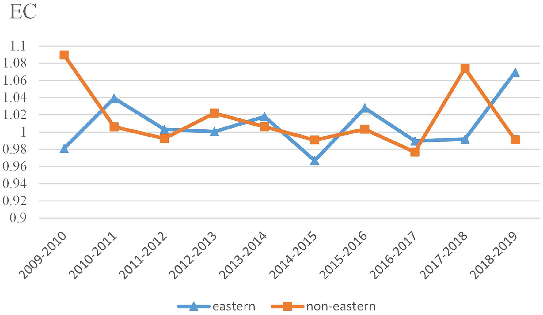 As shown in Figure 1B, the spatial and temporal distribution patterns of HEII are similar to those of HEIG. Figure 1C describes the time trend of HEIC under contemporary frontier. HEIC in the two regions keeps stable with less fluctuation during 2009–2019. Moreover, HEIC values in eastern region are higher than those in non-eastern region. Overall, the two regions show similar time trends of HEI under the influence of policies.