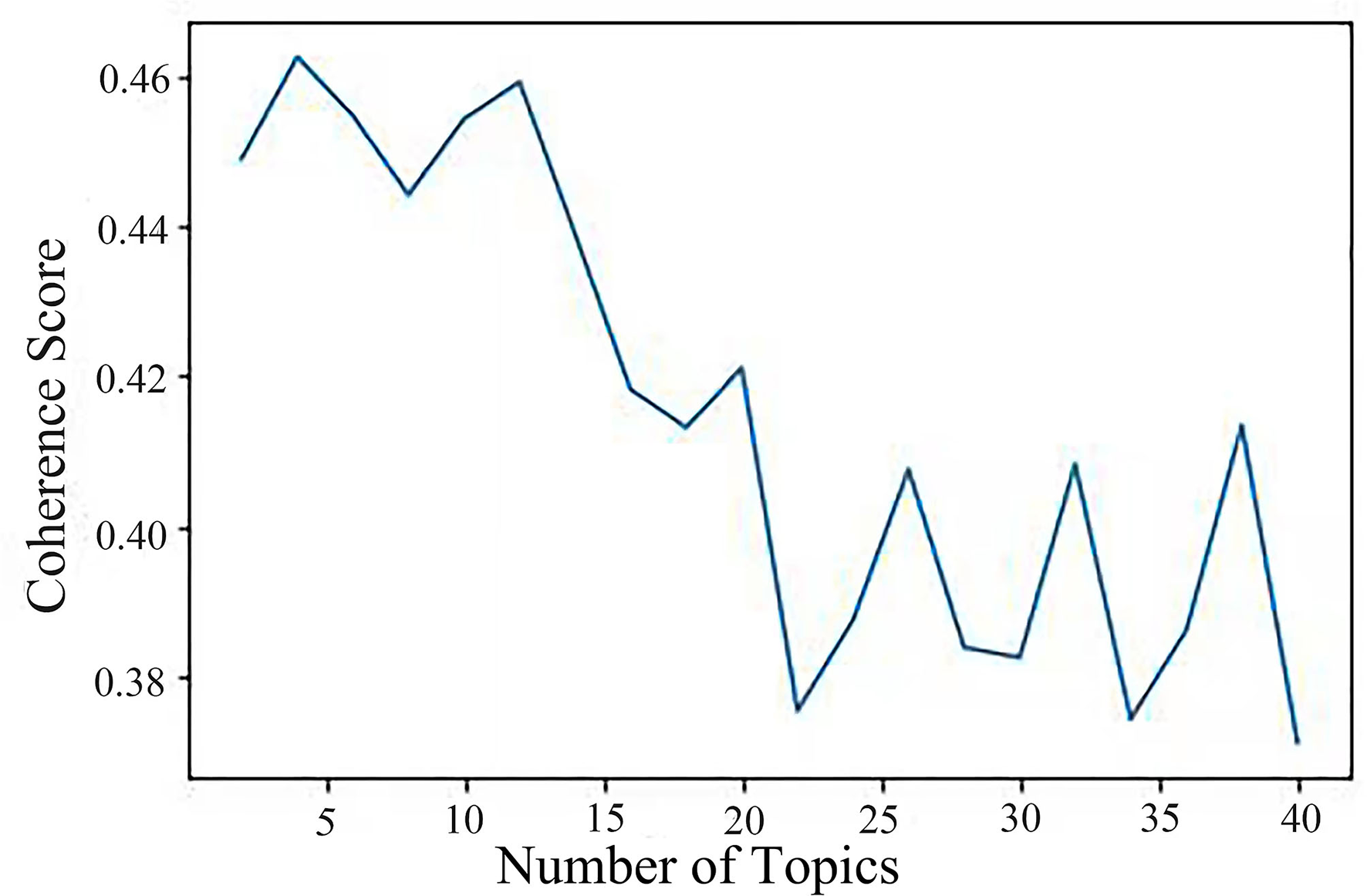 The topic coherence score compels the number of topics K and when the coherence score is the highest, K takes the optimal value. This article employs the assessment index coherence score in the statistical language model show to decide the ideal number of topics (29).