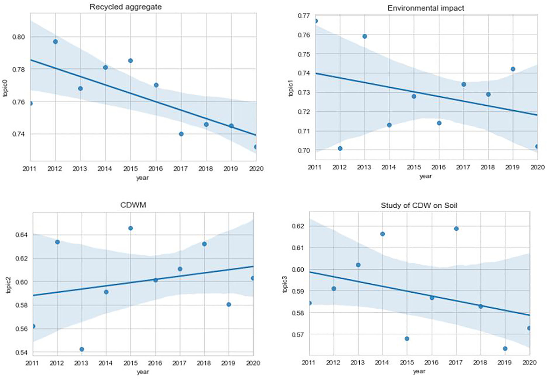 The average annual weights of articles per topic from 2011 to 2020 are shown in Figure 4. A trend could not be discerned in this article because there were not enough data points. Consequently, the graph was redrawn with a regression line to show the trend of change.