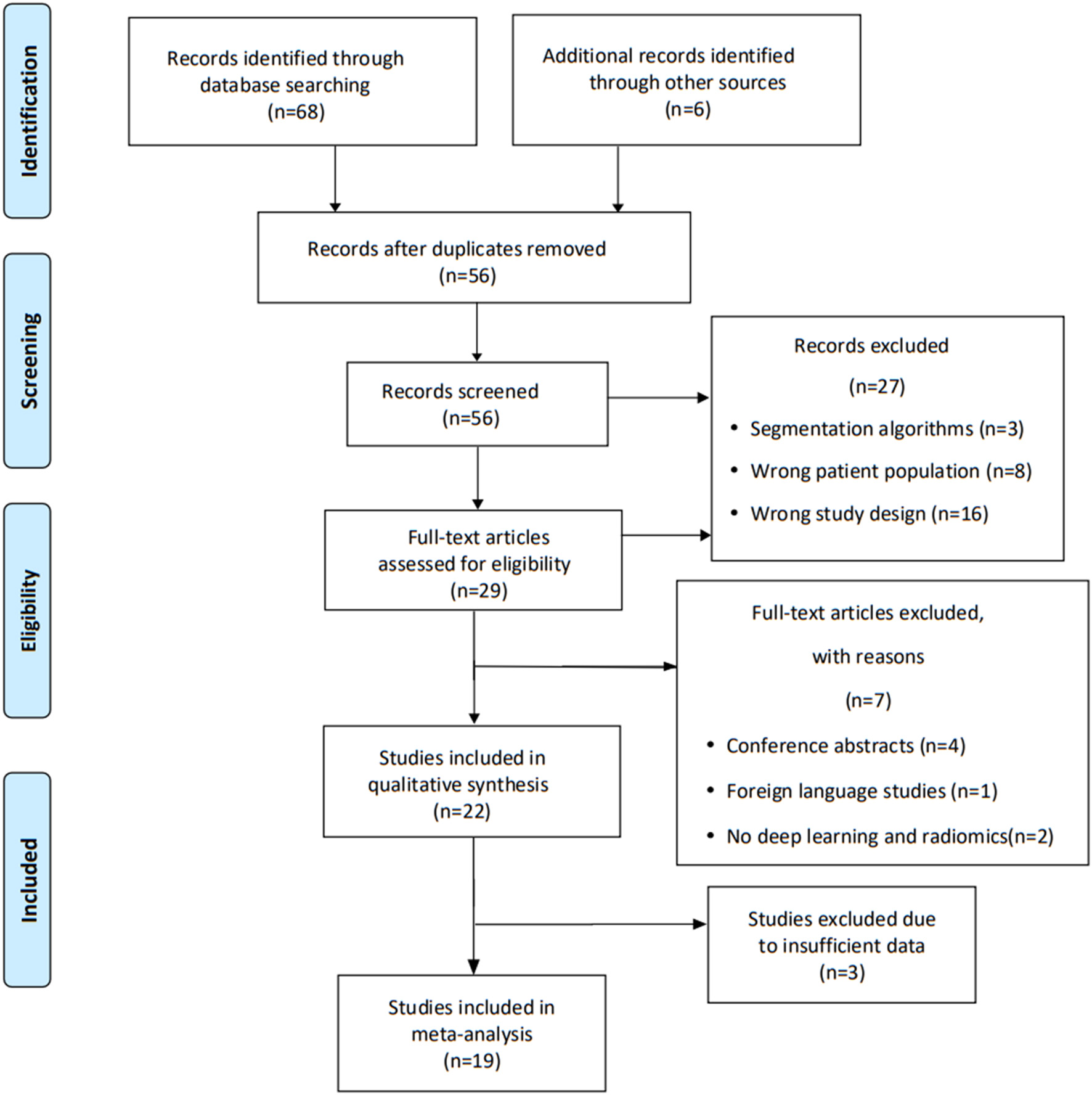 Our search identified 74 studies, with 56 screened after removing duplicates. Of these, 27 did not meet the inclusion criteria based on title and abstract. The remaining 29 full manuscripts were individually assessed, and, finally, 22 studies were eligible and included in our systematic review. Of these, 19 papers were available for meta-analysis, and five articles were excluded because of their insufficient data information. We outline the study selection process for review using the PRISMA flowchart (Figure 1).