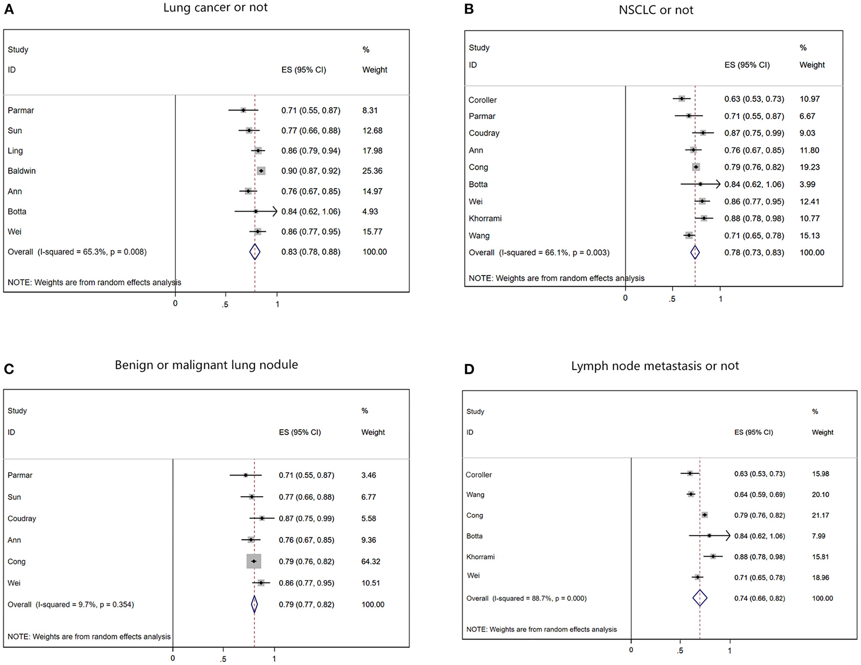 Summary of forest plots for different classifications. (A) The forest plot of determine if a patient has lung cancer. (B) The forest plot of determining whether the cancer type is NSCLC. (C) The forest plot of predicting benign and malignant pulmonary nodules. (D) The forest plot of predicting lymph node metastasis in lung cancer.
