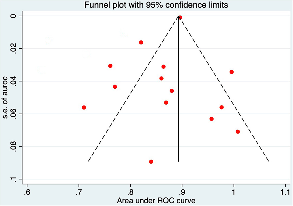 According to the QUADAS-2 tool, the summary of this study's assessment is shown in Figure 3. The risk of bias in patient selection was low in 12 (74%) studies and high in 5 (26%) studies. The risk of bias for the index test was high in 2 studies (10%) and low in 17 studies (90%). The risk of bias for the reference standard test was low in 16 studies (85%), high in 2 studies (10%), and unclear in 1 study (5%). Process and timing made the risk of bias unclear for all 19 studies. Table 4 shown individual evaluation of the risk of bias and applicability. Overall suitability issues are low. To assess the publication bias of the studies, a funnel plot was constructed (Figure 4). The shape of the funnel plot revealed asymmetry in the included studies, showing study heterogeneity.