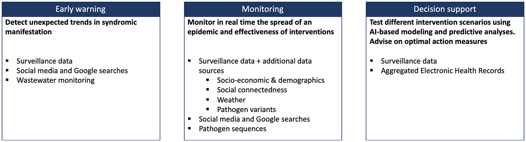 Based on these considerations, the French-German collaborative project AIOLOS (Artificial Intelligence Tools for Outbreak Detection and Response) has recently started with the aim to strengthen the resilience of national healthcare systems against future outbreaks of respiratory infections2. More specifically, AIOLOS identifies three areas, where population-level computational modeling, including techniques from Artificial Intelligence (AI) and machine learning (ML), could potentially impact the preparedness against future pandemics based on various data sources (Figure 1):