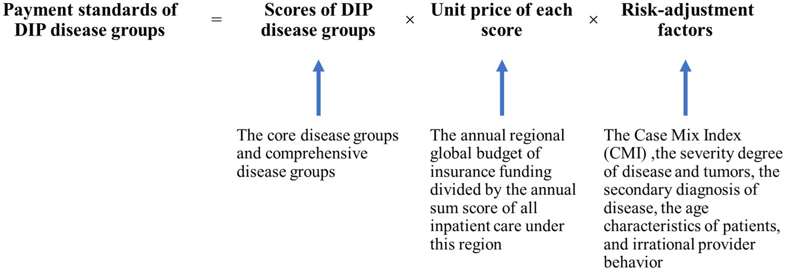 As with the DRG payment system, the DIP payment includes a series of classifications of DIP disease groups. Based on the same major diagnosis principles and similar treatment procedures, the National Healthcare Security Administration firstly enacted the uniform score catalogue and classification standards of the DIP disease groups, containing 11,553 core disease groups and 2,499 comprehensive disease groups. Subsequently, according to the uniform classification standards of the DIP disease groups, the 71 pilot cities of the DIP payment reform throughout China were required to enact the catalog of core disease groups and comprehensive disease groups. Meanwhile, the pilot cities needed to formulate the average score of each local DIP disease group by using the average medical cost of all inpatient care cases in the last 3 years.