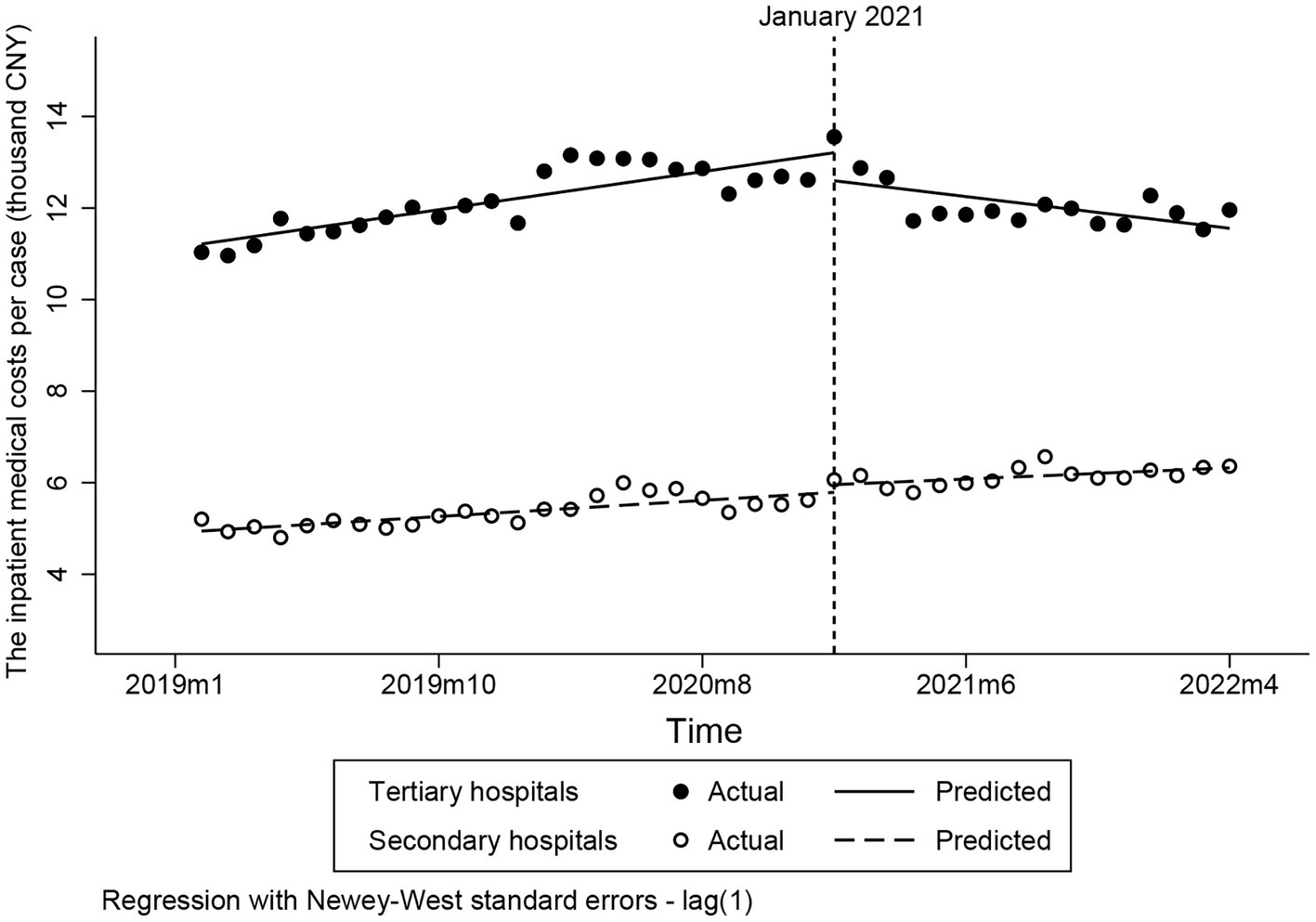 Figure 2 demonstrates that the inpatient medical costs per case in tertiary hospitals perceptibly decreased after the intervention. The inpatient medical costs per case in tertiary hospital decreased by 150 CNY per month compared to the pre-intervention trend (p < 0.001) (Table 3). Moreover, compared to the pre-intervention trend, the inpatient medical costs per case in secondary hospital decreased only slightly after the intervention, having no statistically significant difference (p = 0.307). However, the inpatient medical costs per case in tertiary hospitals keep decreasing by 0.07 CNY per month, which is opposite to that in secondary hospitals (p < 0.05) (Table 3).