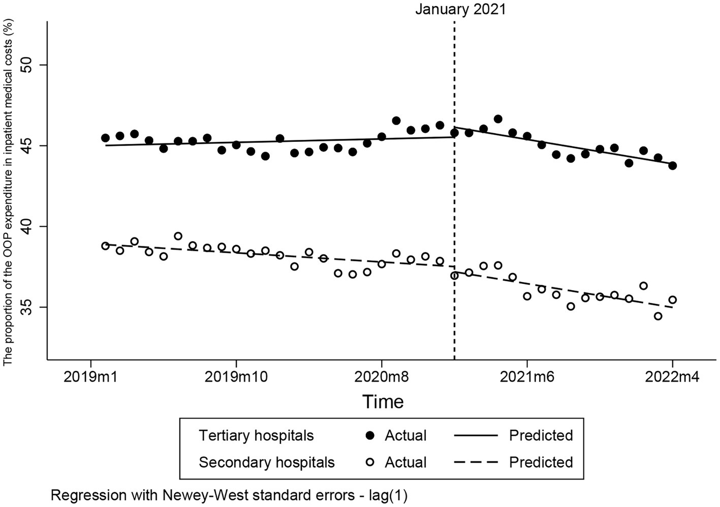 After the intervention, the proportion of the OOP expenditure in inpatient medical costs in secondary and tertiary hospitals both decreased slightly (p < 0.001) (Figure 3). The proportion of the OOP expenditure in inpatient medical costs in secondary decreasing by 0.09 percentage points per month compared to the pre-intervention trend (p < 0.01). Furthermore, the reduction in the proportion of the OOP expenditure in inpatient medical costs in tertiary hospital was more pronounced than that in secondary hospital (Table 3), decreasing by 0.17 percentage points per month compared to the pre-intervention trend (p < 0.001) (Table 3).