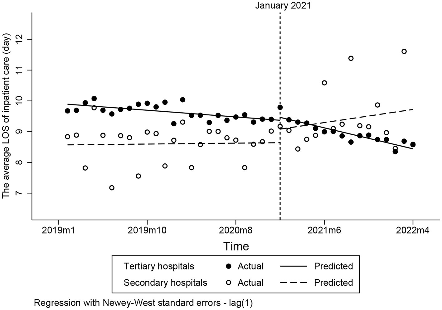 Prior to intervention, the baseline trend of the average LOS of inpatient care in secondary and tertiary hospitals had no obvious difference (Figure 4). After the intervention, the average LOS of inpatient care in secondary immediately increase 0.44 day in February 2021 which is significantly obvious than that in tertiary hospitals (p = 0.211). However, the change in average LOS of inpatient care in secondary and tertiary hospitals were opposite. Compared to the pre-intervention trend, the average LOS of inpatient care in tertiary hospital decreased by 0.05 day (p < 0.001), and the average LOS of inpatient care in secondary hospital increased 0.04 day (p < 0.001) (Table 3).