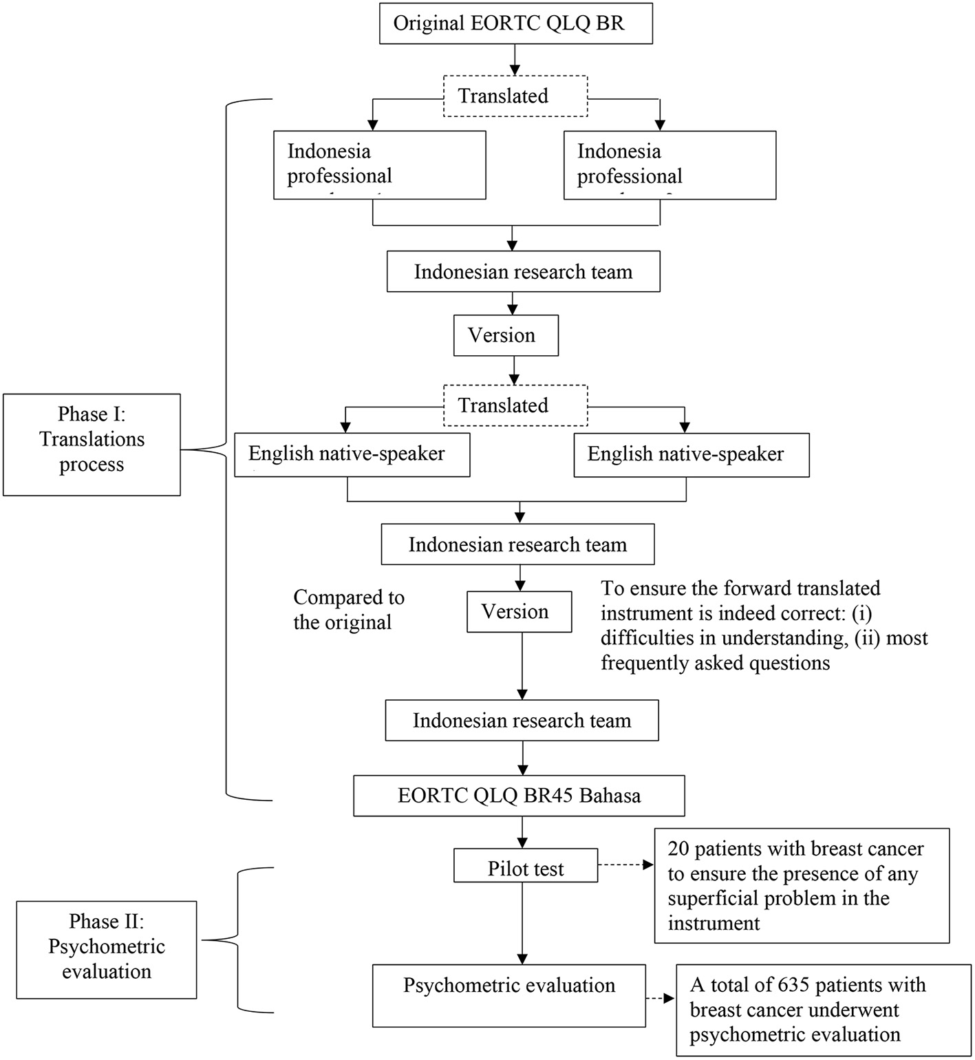 This study used a cross-sectional design. Data collection was performed from July to September 2021 after receiving the ethical clearance from the Research Ethics Committee of Ahmad Dahlan University, Yogyakarta, Indonesia with the issuance of the ethical clearance number 012102016 on April 28, 2021. All participants in this study verbally gave their consent after receiving information on the study and were informed that they could withdraw their voluntary participation at any time. This two-phase study was designed to evaluate the psychometric properties of the Indonesian EORTC QLQ-BR45. The first stage involved translation of the original English version of the questionnaire into the Indonesian version, which was then followed by validation of the translation. The second stage involved the evaluation of the psychometric properties of the Indonesian EORTC QLQ-BR45. Figure 1 presents the flow of this study.