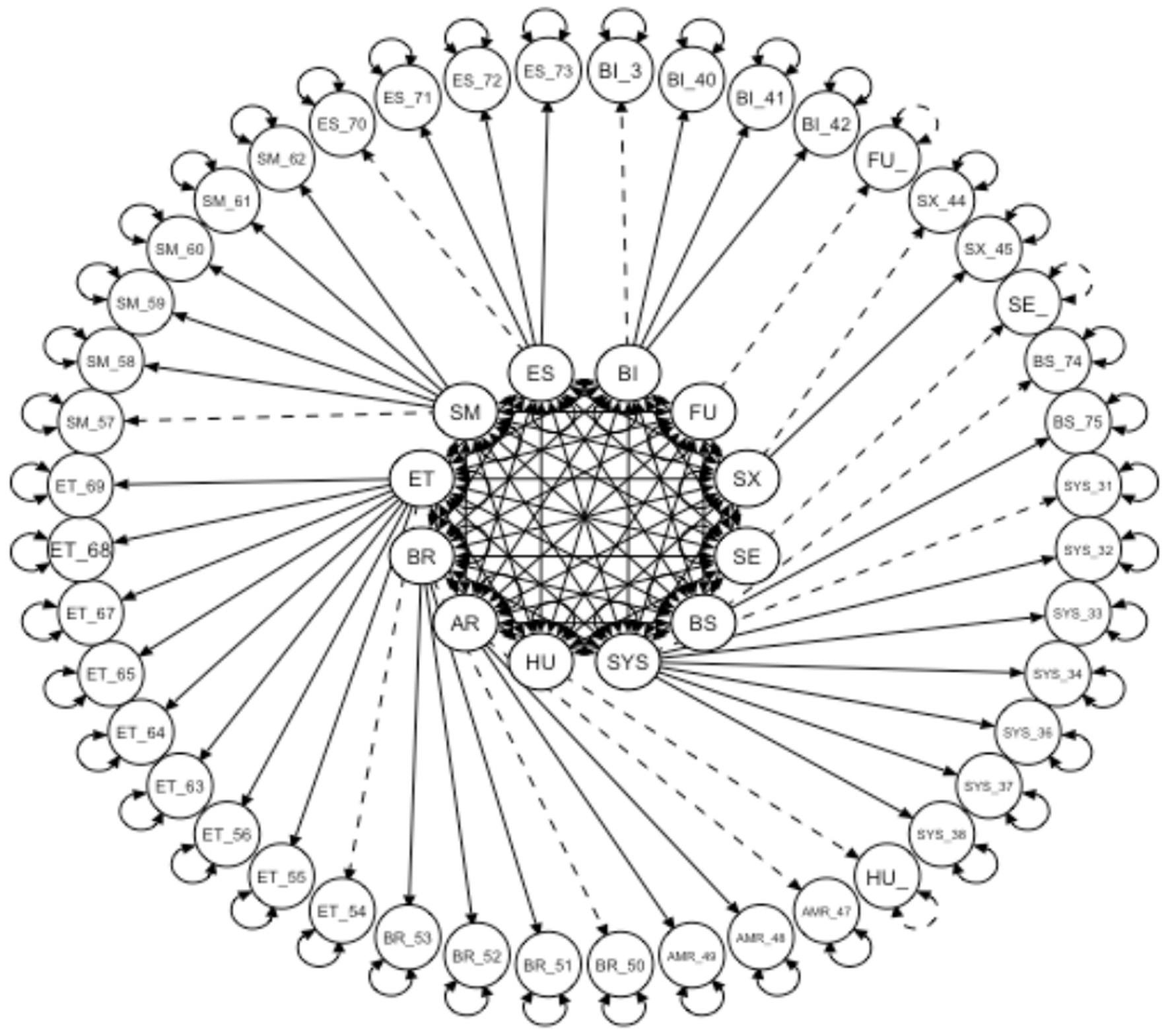 The Indonesian version of the instrument for measuring QoL for breast cancer was translated from the original English instrument known as EORTC QLQ-BR45. A total of 635 participants with a mean age of ≥52.03 ± 9.58 participated in this study. The instrument consisted of 45 items distributed across eleven domains and fit an unweighted least square confirmatory factor analysis. The measurement model for the confirmatory factor analysis (CFA) is shown in Figure 2. The goodness of fit of the Indonesian version QLQ breast cancer was adequate based on the predetermined fit criteria, namely: χ2/df = 2,964.379, df = 839; CFI = 0.92; TLI = 0.90; GFI = 0.92; AGFI = 0.93; RMSEA = 0.06 (95% CI = 0.063–0.066); SRMR = 0.07. The adequacy index of sampling was 0.8 and the Bartlett's sphericity test was statistically significant (χ2 = 16,729.62; df = 990; p-value = < 0.001). All items in the model were loaded substantially on their respective factors, except for the items of the factor-constraint that could not be tested for its significance (Table 2). Table 2 shows that all correlation coefficient values between items and the domain themselves are 0.40, except for items no. 37, 54, 69, and 58. Finally, the measurement model was showed in Figure 2.