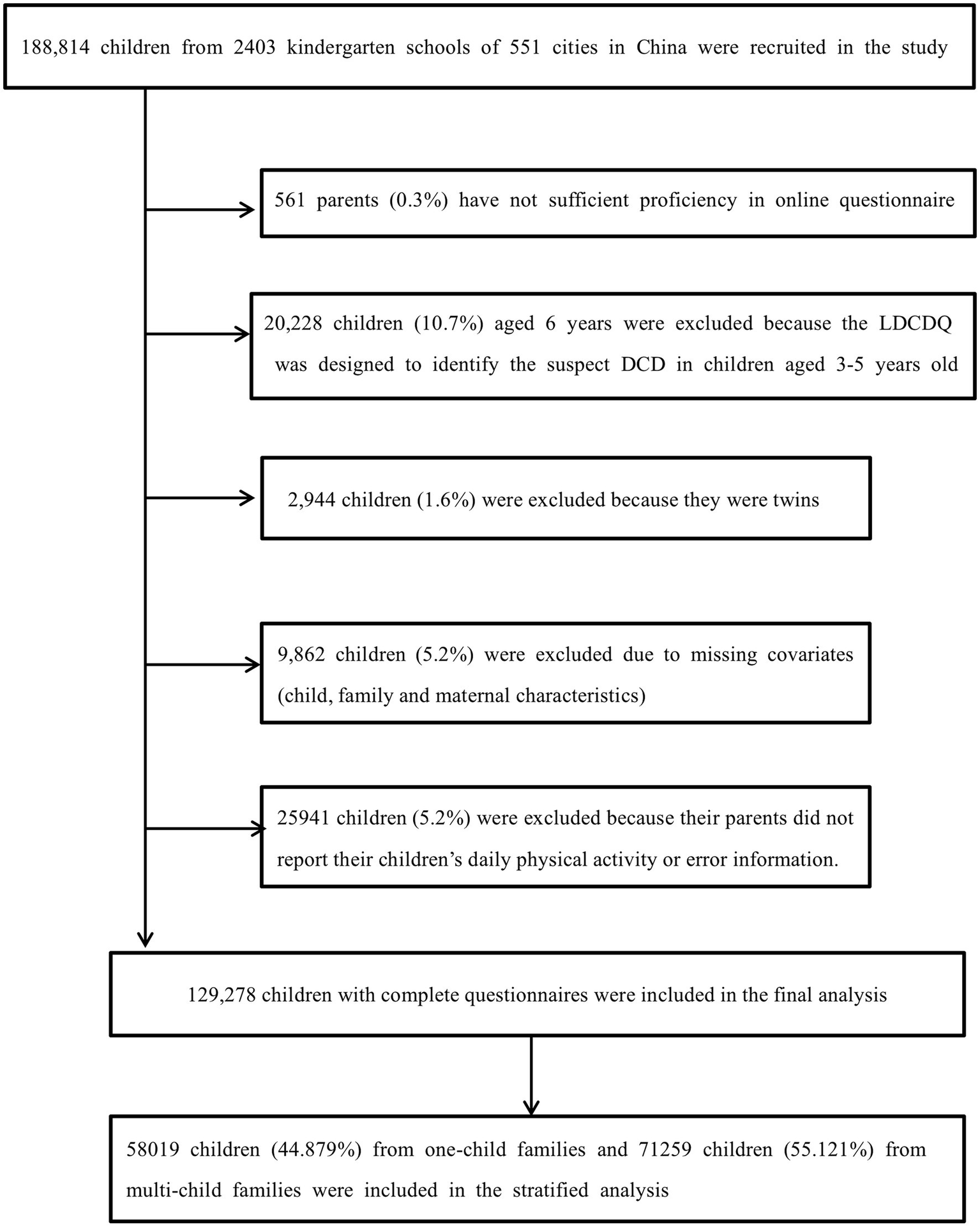 Data were collected from 1st April 2018 to 3rd December 2019, and 188,814 pre-schoolers from 2,403 mainstream nurseries in 551 cities of China were recruited in total. A total of 129,278 children were included in the analysis of the current study (Figure 1). Informed consent has been obtained from all participants. The study was approved by the ethics committee of Shanghai First Maternity and Infant Hospital (KS18156).