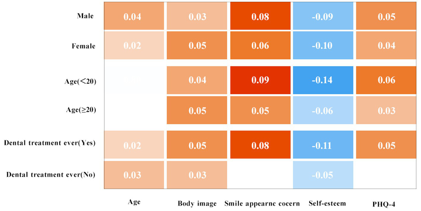 Stratified by whether participants had ever received dental treatment, significant associations were found between perfectionism scores and other characteristics in the dental treatment group, but were not found in smile appearance concern and PHQ-4 stratifications in the non-dental treatment group (see Table 3B; Figure 1).
